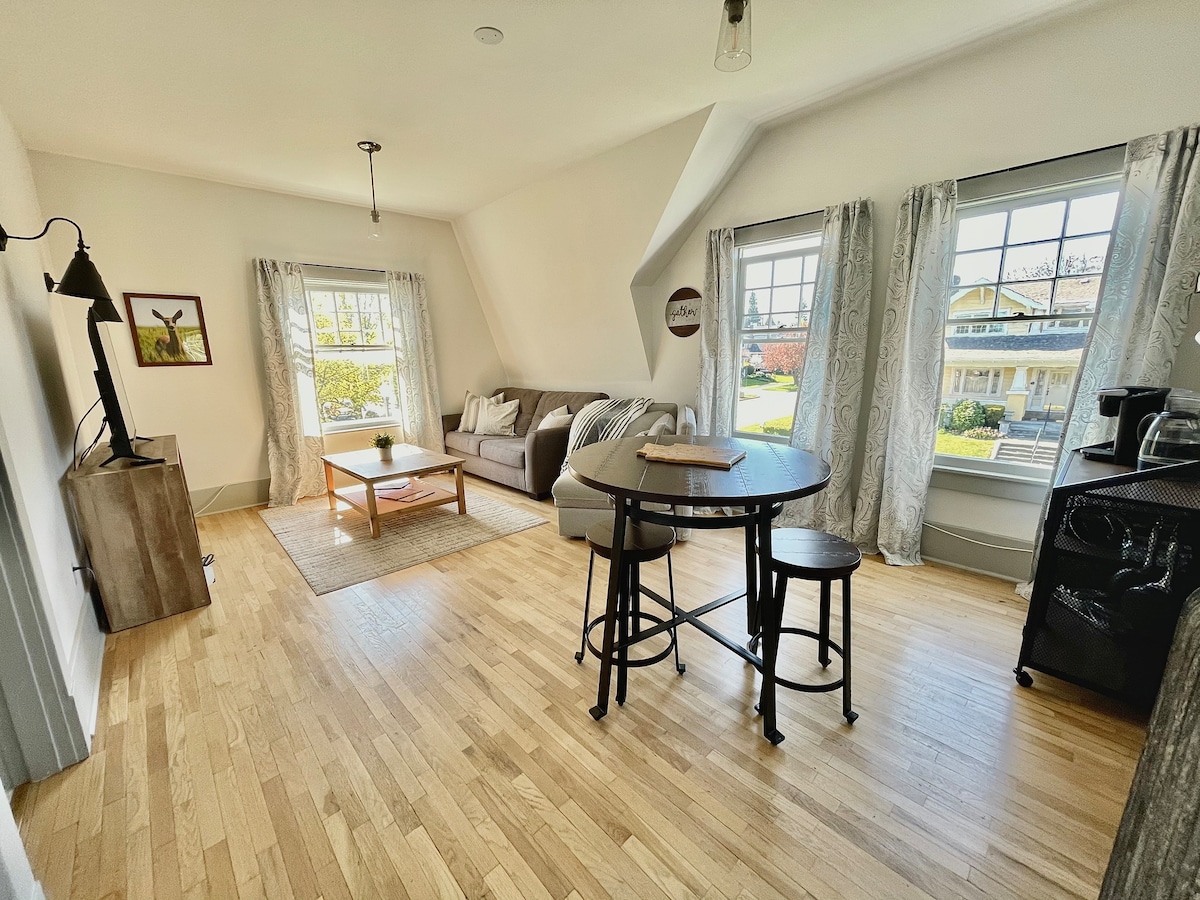 Joli appartement d'une chambre simple, situé au deuxième étage d'une belle maison coloniale néerlandaise de North Tacoma ! Suite parentale avec lit King Size et portes-fenêtres donnant sur la terrasse avec une vue magnifique sur le mont. Plus pluvieux. Salon et salle à manger spacieux avec bar à café, table et chaises, télévision 48", canapé qui se replie en lit double supplémentaire, et plus encore ! Le kitchenette comprend un four à micro-ondes, un grille-pain, une plaque chauffante, un réfrigérateur et tout le nécessaire ! Profitez d'un jeu/placard DVD et d'un bar à café !