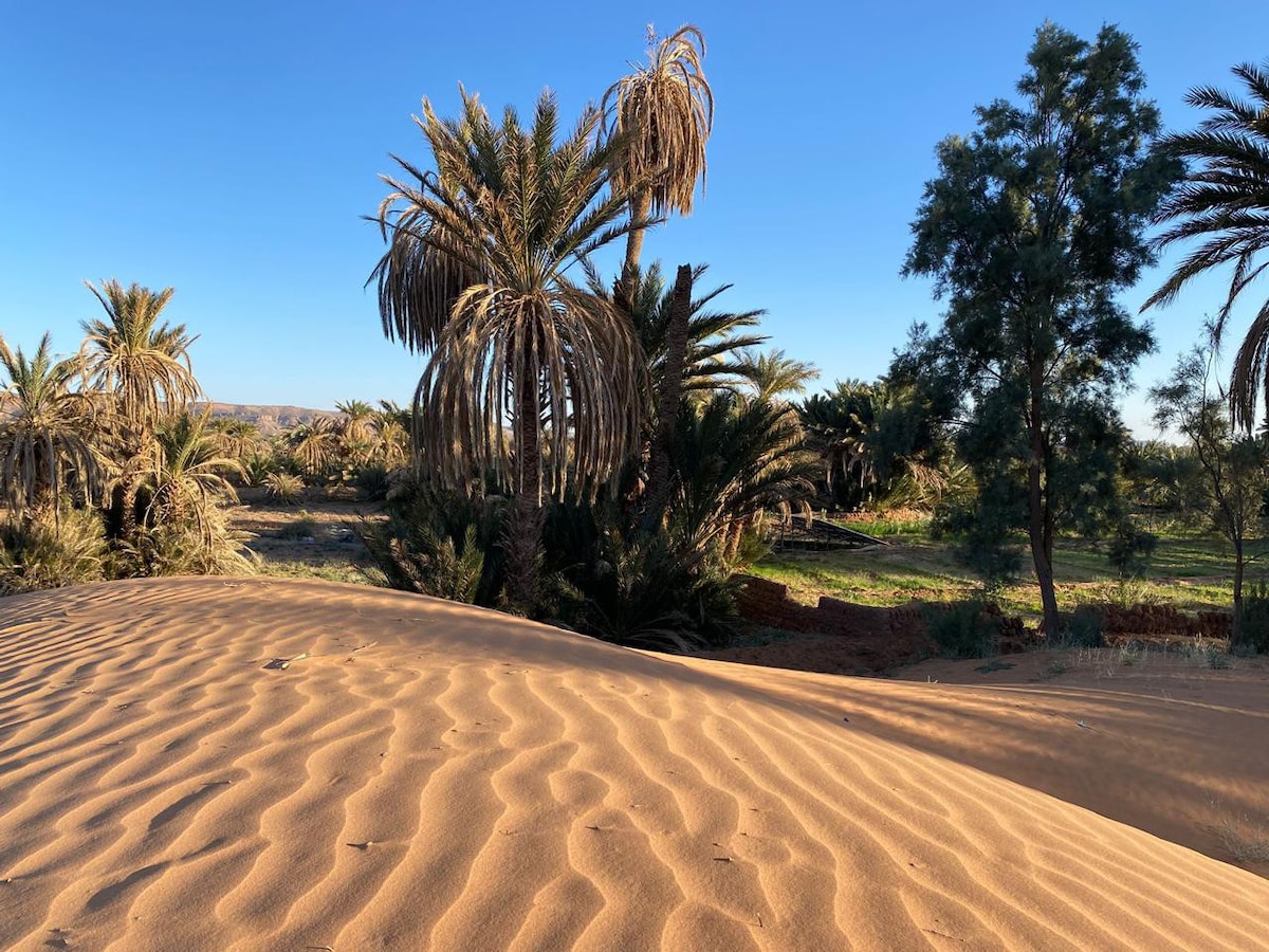 L'Oasis Source de Vie est l'oeuvre de Madani, enfant du désert et de Marie. Ce lieu est né d’un désir profond de renouer avec les traditions ancestrales et de préserver l’environnement fragile du désert. Les habitations sont construites en utilisant au maximum les techniques traditionnelles et les matériaux présents sur place. Aux portes du Sahara vous aurez pour horizon le commencement de l'immensité du désert, vous pourrez chaque soir y admirer le coucher du soleil.