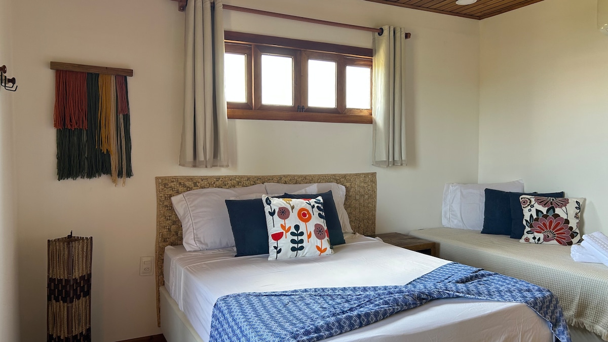 Notre petit coin est simple mais confortable. Une grande cour arrière pleine d'arbres et un hamac sous le pied de Cajú pour la sieste de l'après-midi. Un balcon avec canapé, cuisine équipée. Une chambre spacieuse avec 1 lit double et un matelas simple. Salle de bain avec douche chaude. Et une autre petite cour arrière en arrière-plan surplombant la « forêt ». Je (votre hôte) suis toujours disponible pour tout besoin. Ma maison, votre maison ! Bienvenue !