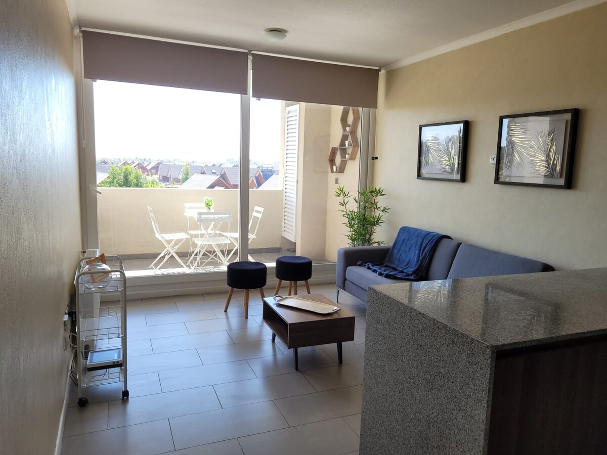 Profitez de ce bel appartement lumineux, confortable et central à Talca. Entièrement équipé pour 5 personnes, avec un excellent emplacement et une bonne connectivité. À 5 minutes du stade Fiscal de Talca, à proximité de l'Université Santo Tomás, du supermarché Jumbo, des pharmacies et des magasins, pour profiter d'un séjour parfait. Caractéristiques - 2 chambres - 1 salle de bain - Salon-salle à manger - Cuisine américaine entièrement équipée - Condo fermé avec conciergerie 24/7 - Wi-Fi - Parking privatif