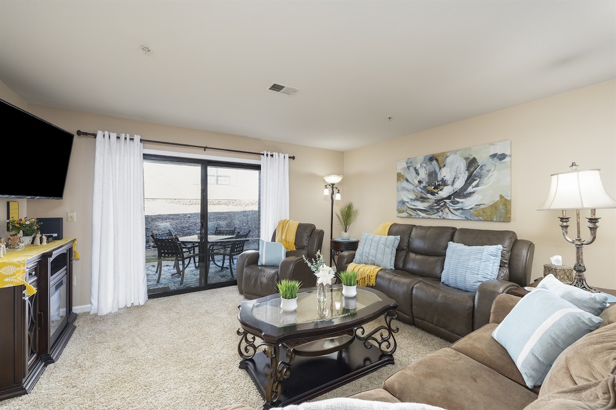 Cette copropriété récemment mise à jour est à 5 min de la Strip, à 15 min du parc d'État de Tablerock et à 15 min de Silver Dollar City. La chambre principale dispose d'un lit King et d'une salle de bains privative, la chambre 2 dispose d'un lit queen et la porte de la salle de bain principale, il y a également un canapé-lit dans le séjour. Nous sommes juste en face du club house où vous pourrez nager à l'intérieur ou à l'extérieur, profiter du spa ou du sauna et transpirer avec les machines d'exercice disponibles. Nous autorisons jusqu'à deux chiens de moins de 30 livres qui ne se perdent pas.