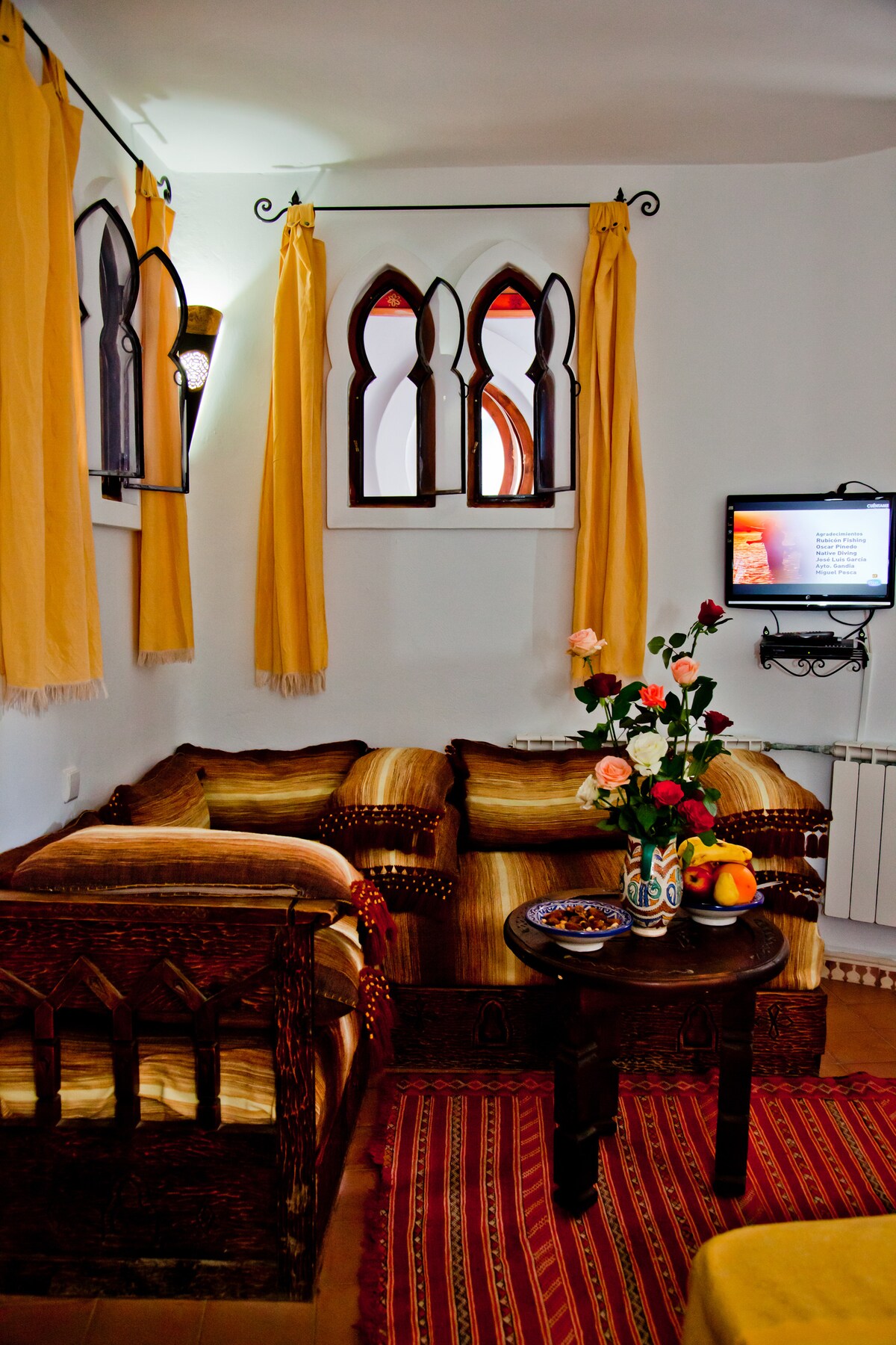 Nous vous proposons la Battuta Suite, une charmante suite baignée de soleil. Le salon en véranda offre une vue incroyable sur le port de Tanger, tandis que la chambre bénéficie d'une vue sur la Médina. Le petit-déjeuner, non-inclus dans le tarif, est servi chaque matin de 8h à 10h. Savourez une boisson chaude, un jus d’orange, du pain et des crêpes marocaines, accompagnés de confiture, amlou, fromage, œuf plat ou brouillé et un yaourt.