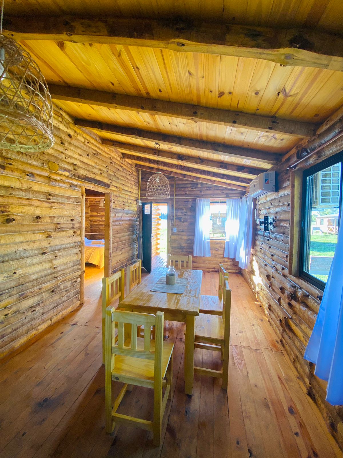 Dans l'espace intérieur de chaque cabane, vous trouverez une cuisine-salle à manger complète. Il dispose d'un ensemble de salle à manger, d'ustensiles de cuisine et appareils électroménagers de première ligne, bouilloire électrique, four électrique avec anafe, réfrigérateur rétro vintage. En outre climatisation chaud/froid, Smart TV avec Android et Wi-Fi. Les chambres sont adaptées pour deux et quatre personnes, selon le chalet. Ils ont des lits super king size 2Mx2M, linge de lit complet unique et calme.