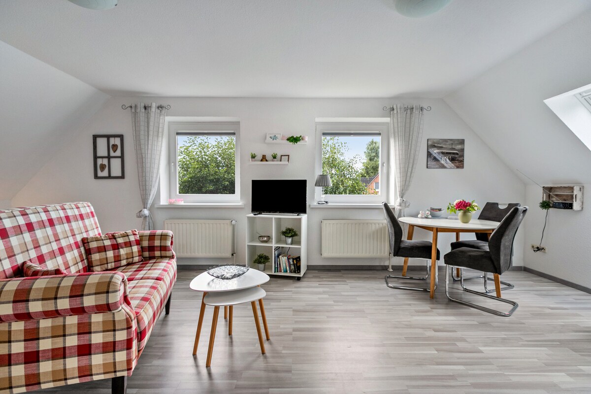 Appartement 2 pièces dans la propriété historique au toit de chaume Hus op de Dün, 40 m², rez-de-chaussée, entrée privée, confort, style et charme du nord de l'Allemagne. Avec deux lits boxspring, cuisine séparée, salon et salle à manger, télévision, wifi et équipements modernes, il est idéal pour 2 personnes. Self checkin flexible. Draps et serviettes inclus. Profitez de la terrasse ou du parc de 7 000 m² avec transats, barbecue, aire de jeux et espace yoga, détente ou surf. Chiens acceptés.