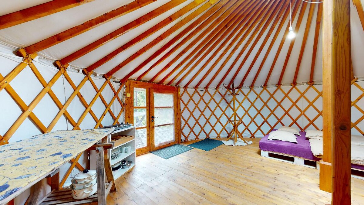 Notre yourte est située directement sur les rives du Danube. C'est un endroit idéal pour se blottir, se retirer, profiter de la proximité de l'eau et des montagnes, été comme hiver. La yourte est isolée, chauffée, climatisée, équipée d'une cuisine et d'une salle de bain, afin que vous puissiez profiter de la nature en tout confort. Nous avons créé un lieu spécial, où vous pouvez admirer le ciel étoilé depuis votre lit. Lors de la conception du jardin, il était important de préserver l'état naturel, de sorte que l'herbe est tondue de manière écologique.