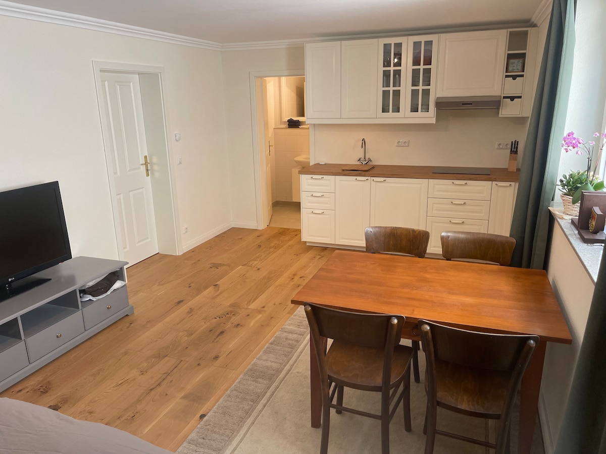 Nous louons un appartement confortable et joliment meublé de 2 pièces à l'étage supérieur d'une maison de campagne bavaroise originale avec balcon sud et jardin paradisiaque pour 4 personnes. La maison se trouve dans un quartier résidentiel calme, à 10 minutes à pied de la gare et du centre-ville avec tous ses commerces. Une belle forêt se trouve à proximité. Des excursions à Munich et dans la belle campagne bavaroise peuvent facilement être faites en voiture ou en train. Vous pouvez utiliser le jardin et les vélos.