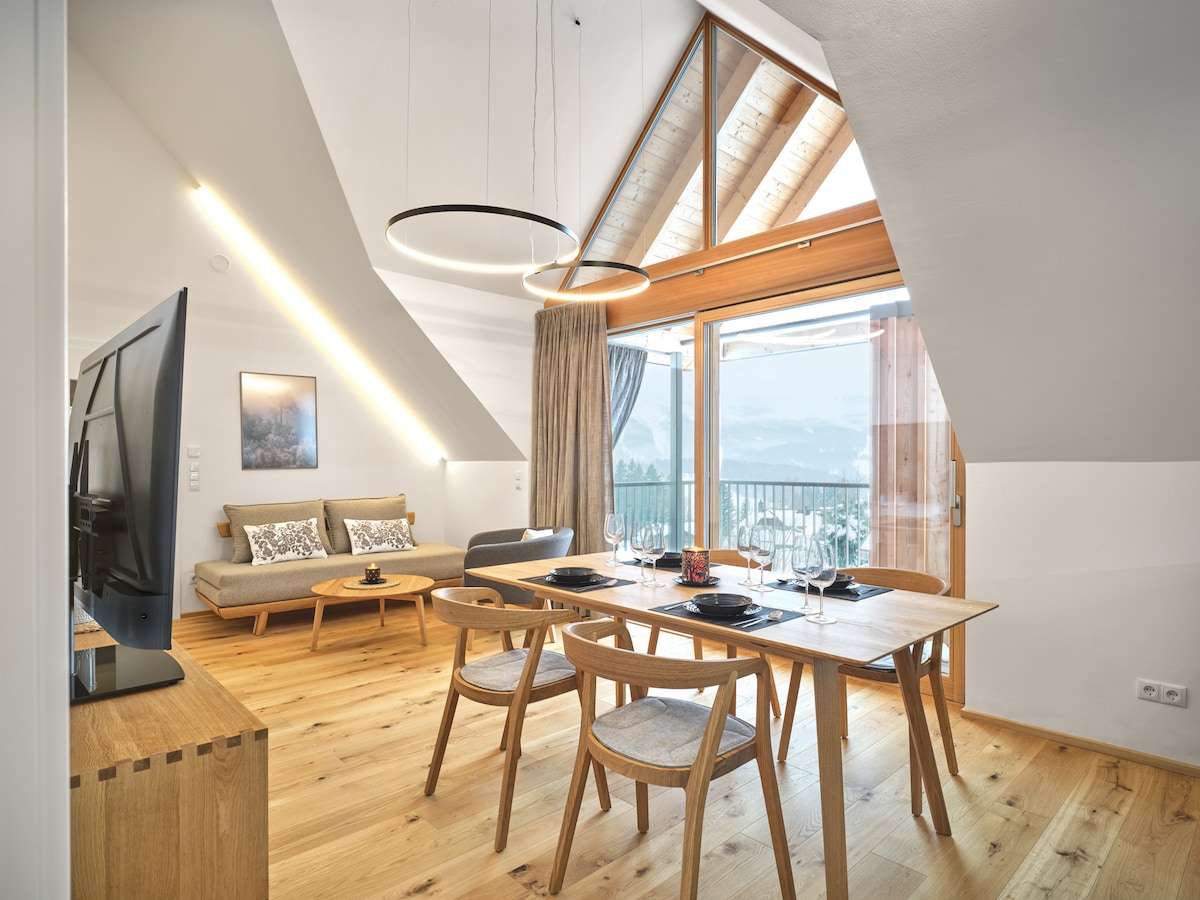 Le chalet luxueux construit en 2018 est situé sur une pente ensoleillée dans la rangée supérieure du village alpin avec la meilleure vue panoramique, à 1 300 mètres d'altitude. m. à seulement un « jet de pierre » du remonte-pente (environ 300 m) et de la piste de ski visible. La construction massive en bois et l'emplacement de première classe du chalet offrent une atmosphère confortable, relaxante et saine. - Le design suit la fonction - La modernité rencontre la tradition - La propriété ne laisse pratiquement rien à désirer pour profiter de la plus belle période de l'année.