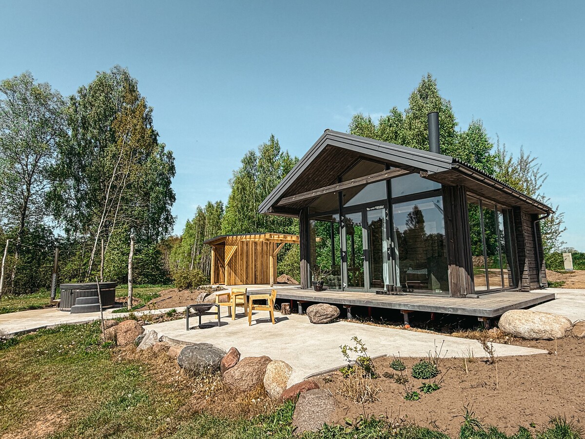 Embrassez la tranquillité dans notre chalet au bord de la rivière Mituva. Détendez-vous dans le sauna, plongez dans le jacuzzi et explorez l'eau avec des canoës et des paddleboards. Idéal pour les amateurs de nature. La cabane dispose d'un intérieur spacieux et bien aménagé avec une touche d'élégance rustique. Le salon ouvert est orné d'un foyer au bois, de nombreux sièges avec deux tables massives et de grandes fenêtres qui offrent une vue imprenable sur la rivière et la forêt environnante. DM pour plus d'informations avant de réserver !