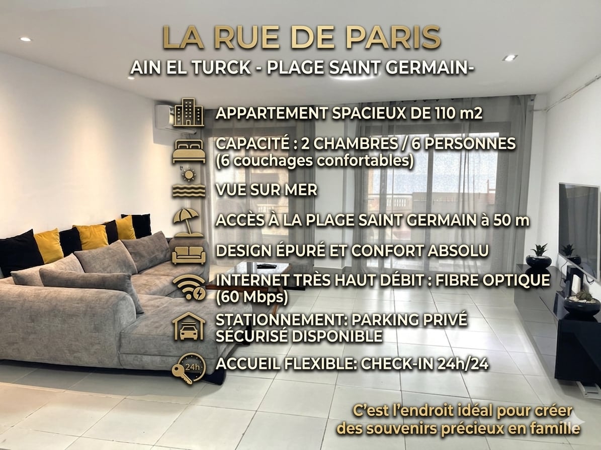 Profitez en famille de ce fabuleux logement neuf et paisible avec vue sur mer 🌊. Cet appartement de 110 m² à Ain El Turck est entièrement meublé et équipé : terrasse face à l'eau, à 50m de la plage Saint Germain 🏖️ et 100m du rond-point El-Chems . Les points forts : • 🌐 Internet Très Haut Débit : Fibre Optique (60 Mbps). • 🚗 Stationnement : Parking privé sécurisé disponible à 200m. • 🔑 Accueil flexible : Check-in 24h/24 grâce à mon collaborateur sur place. N'hésitez pas à me contacter. 🙂