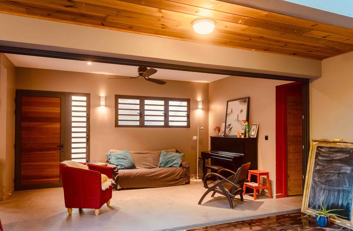 petite maison créole dans un décor très végétal,situé à proximité de la ville et des plages(10 mîn à pied)arrêt de bus,restaurants et magasin de proximité à 150m, quartier tres calme le week-end et durant les vacances scolaires,sinon nuisances sonores possibles aux heures de pointe( proximité d'une ecole) et la cloche de l'église! Des places de stationnement disponibles autour de la maison. Présence de 2 chats et une chienne gentille.
