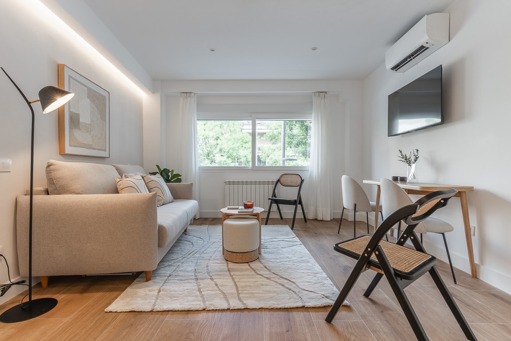 Appartement d'une chambre et d'une salle de bains avec un canapé-lit extraordinairement confortable, récemment redécoré et dans un emplacement exceptionnel : à deux pas des quartiers de luxe tels que Cuzco et Orense Street, du stade Santiago Bernabéu et de Nuevos Ministerios. Place de parking intérieure incluse dans le prix de la location. Très calme, idéal pour bien se reposer pendant la nuit tout en étant proche des points chauds, des restaurants et des commerces.
