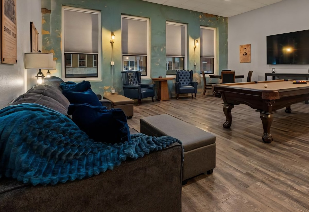 🚂 Tous à bord pour un séjour au centre-ville de Denison Ce loft sur le thème du train, situé sur la rue historique Main Street, est plein de caractère Décoration 🛤️ d'inspiration ferroviaire + hauts plafonds 🛏️ Lit king size + canapé-lit queen size (peut accueillir jusqu'à 4 personnes) ☕ Café juste à côté + 🍺 brasserie juste derrière le bâtiment 📺 Diffusez vos contenus préférés, ☕ prenez un café ou détendez-vous 🛍️ Sur la rue historique Main Street 💕 Parfait pour les couples, les 👨👩👧 petites familles ou les voyageurs 💻 d'affaires