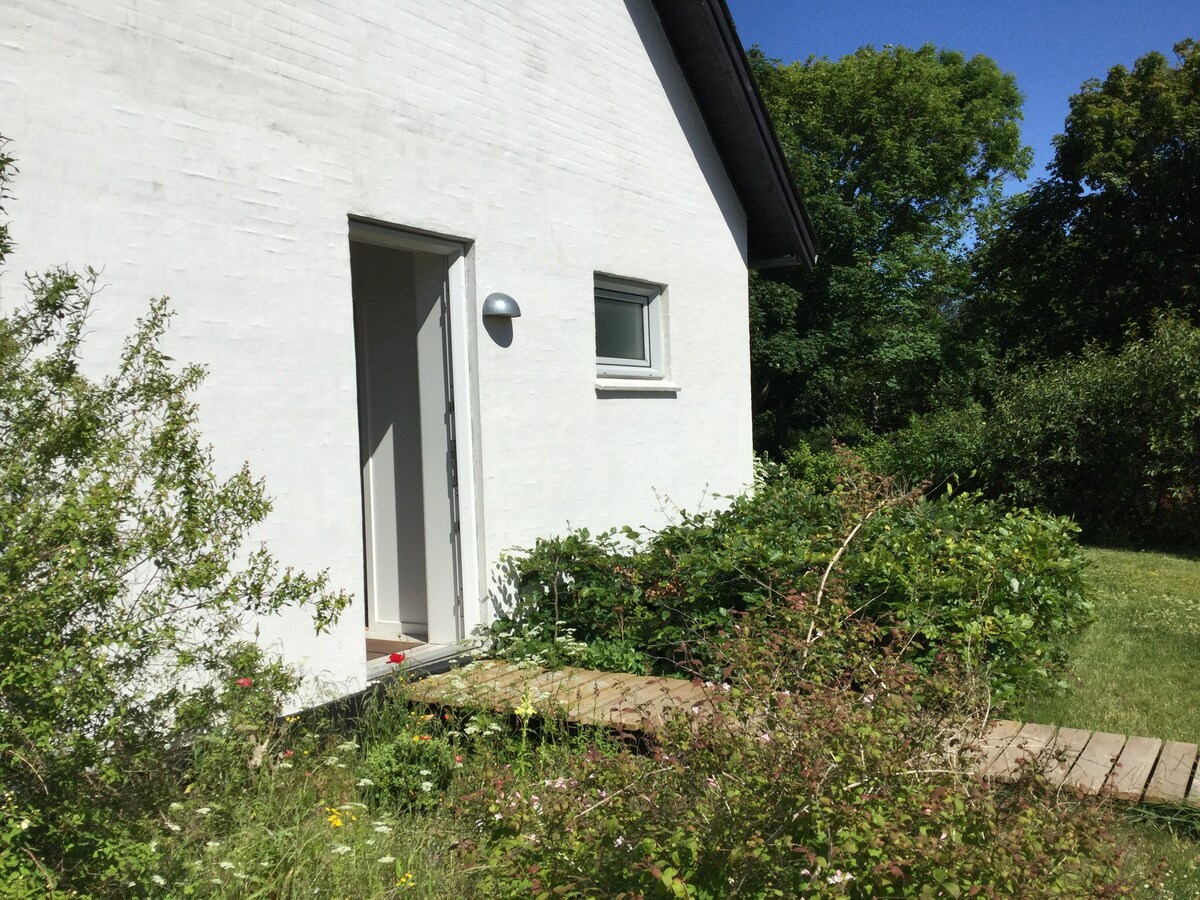 Unique cozy apartment in Klitmøller, the center of Cold Hawaii. The building is located in the local school area with playgrounds,skate ramp, sports grounds etc. available for free use outside School hours. The apartment consists of: - a bedroom with a doble bed (140x200 cm) and a garden exit to the South - a kitchen with dinner space for 3 or 4 people and a build in daybed - a spacious hallway with a private entrance - a private bathroom - a wooden terrasse facing South