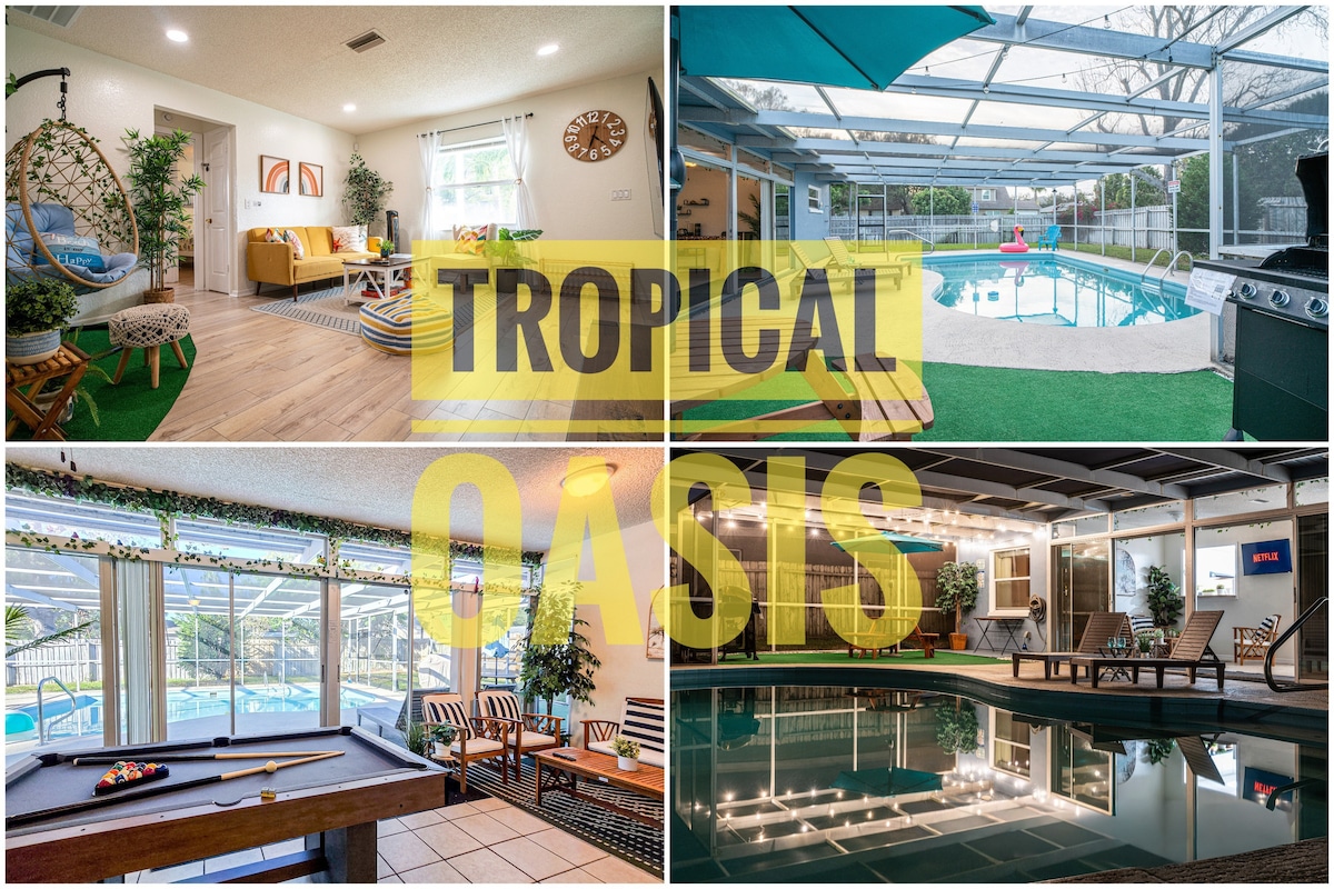 Solar Heated Pool, Billiard/Pool & Foosball Table, Games and More! Screened Backyard = No mosquitos! Prime location, 5 mins drive to Indian Rocks & Belleair Beach, FL Botanical Garden, Splash Harbor Water Park, restaurants, groceries, shops. 15-20 mins drive to Clearwater & Madeira Beach. Spacious, & well-stocked vacation house, featuring a dreamy pool/lanai/BBQ, tropical decors, & plenty of entertainment (games, 3 Roku TVs 43'-58', beach amenities), and 4 queen/full beds. Perfect getaway!