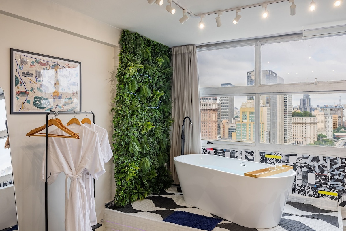 Vista do Mirante est un studio plein de charme et de confort pour que les couples puissent profiter d'une expérience unique. Il bénéficie d'un emplacement incroyable dans le centre historique de SP, dans le bâtiment qui possède l'une des cartes postales SP les plus importantes qu'est Sampa Sky. Avec une vue imprenable, car il est situé au 27e étage et juste en face de la vallée d'Anhangabaú. Vous ferez de belles photos car l'espace dispose d'une décoration romantique, de belles taches décorées, d'une baignoire avec de l'hydro et de la chromothérapie