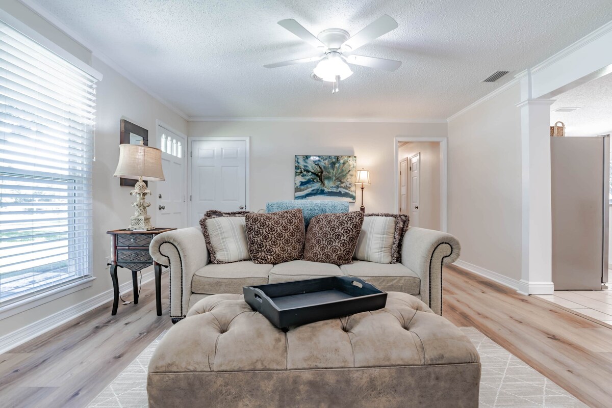 À quelques minutes de l'autoroute 10, venez vous détendre et emmenez vos animaux de compagnie avec vous, il y a une cour clôturée pour qu'ils puissent courir et jouer. Il y a un parking couvert (un véhicule) qui est juste au-dessus de l'entrée latérale, cela permet également une arrivée/un départ sans contact. Il y a beaucoup d'intimité dans la cour arrière, et il est agréable de s'asseoir à l'extérieur et d'écouter les oiseaux et les écureuils. La maison est située à 10 à 15 minutes du centre-ville de Mobile et à 40 minutes de la plage de Dauphin Island et des casinos.