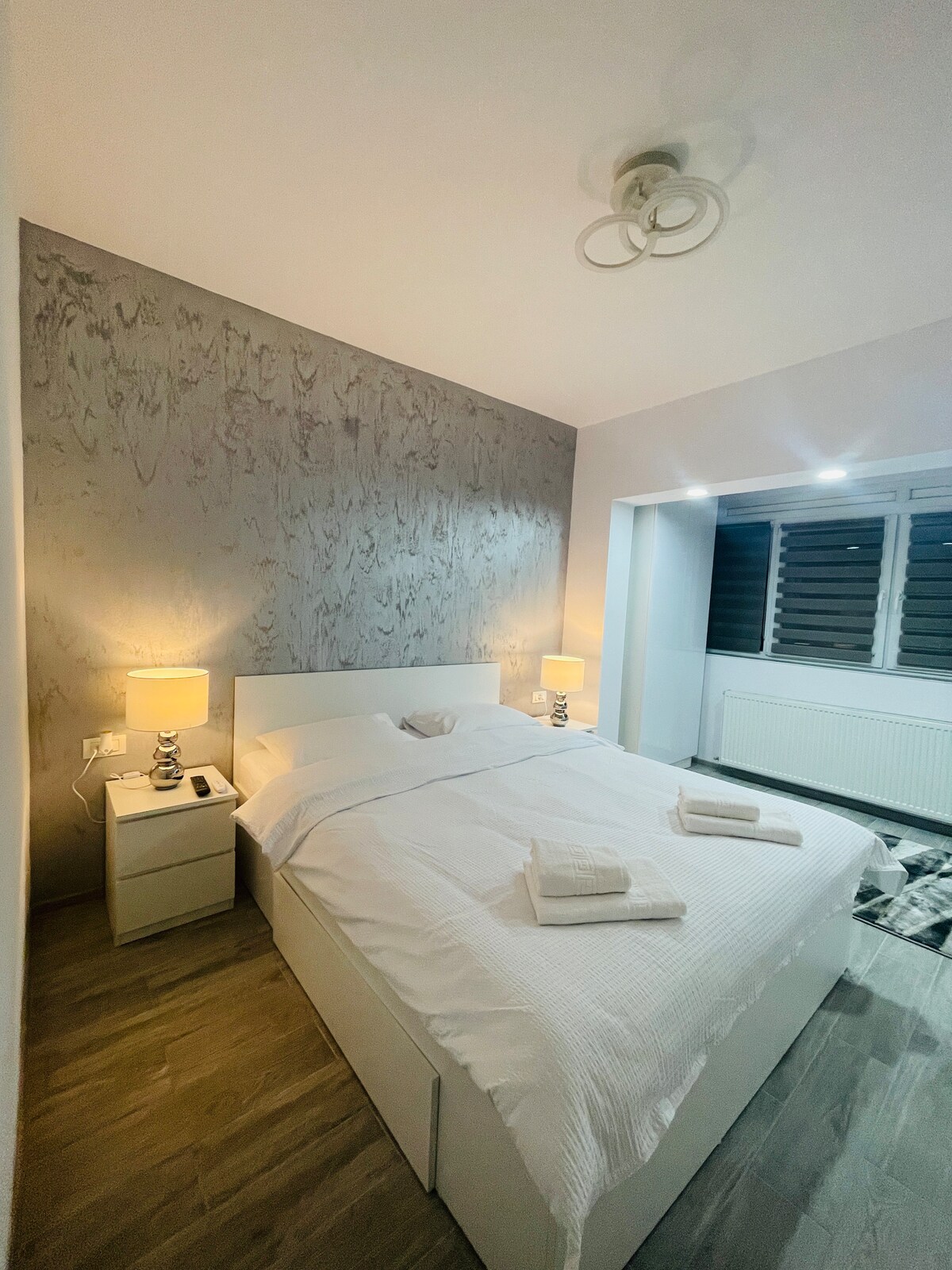 Appartement neuf lumineux avec un design moderne et un parking gratuit. Elle est située à l'entrée de Timisoara, dans le quartier de la station-service Esso. L'appartement est équipé de : - Cuisine entièrement équipée avec tout le nécessaire : plaque de cuisson électrique, four, lave-vaisselle, réfrigérateur, machine à café et vaisselle. - Lavabo ouvert où les voyageurs peuvent profiter d'un film, sur un canapé confortable, sur une télévision intelligente - Chambre avec lit King Size ; - Bébé avec cabine de douche et lave-linge avec sèche-linge.