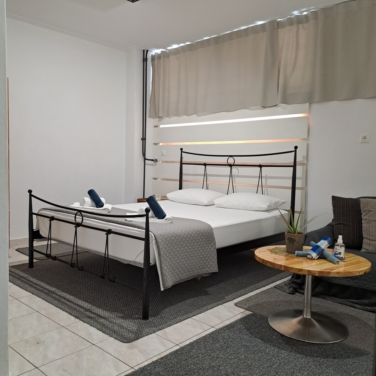 A stylish, fully renovated studio in the city, ideal for couples and business travelers The open-plan layout features a modern living and sleeping area, separated by an elegant wooden design divider that offers privacy and a bright, spacious feel. Fully equipped for a comfortable stay, with easy access torestaurants, cafés An ideal choice for guests seeking comfort, style and convenience in a central location ✅️Wi-Fi ✅️Smart TV ✅️Netflix ✅️Natural gas ✅️Air conditioning ✅️Private outdoor space
