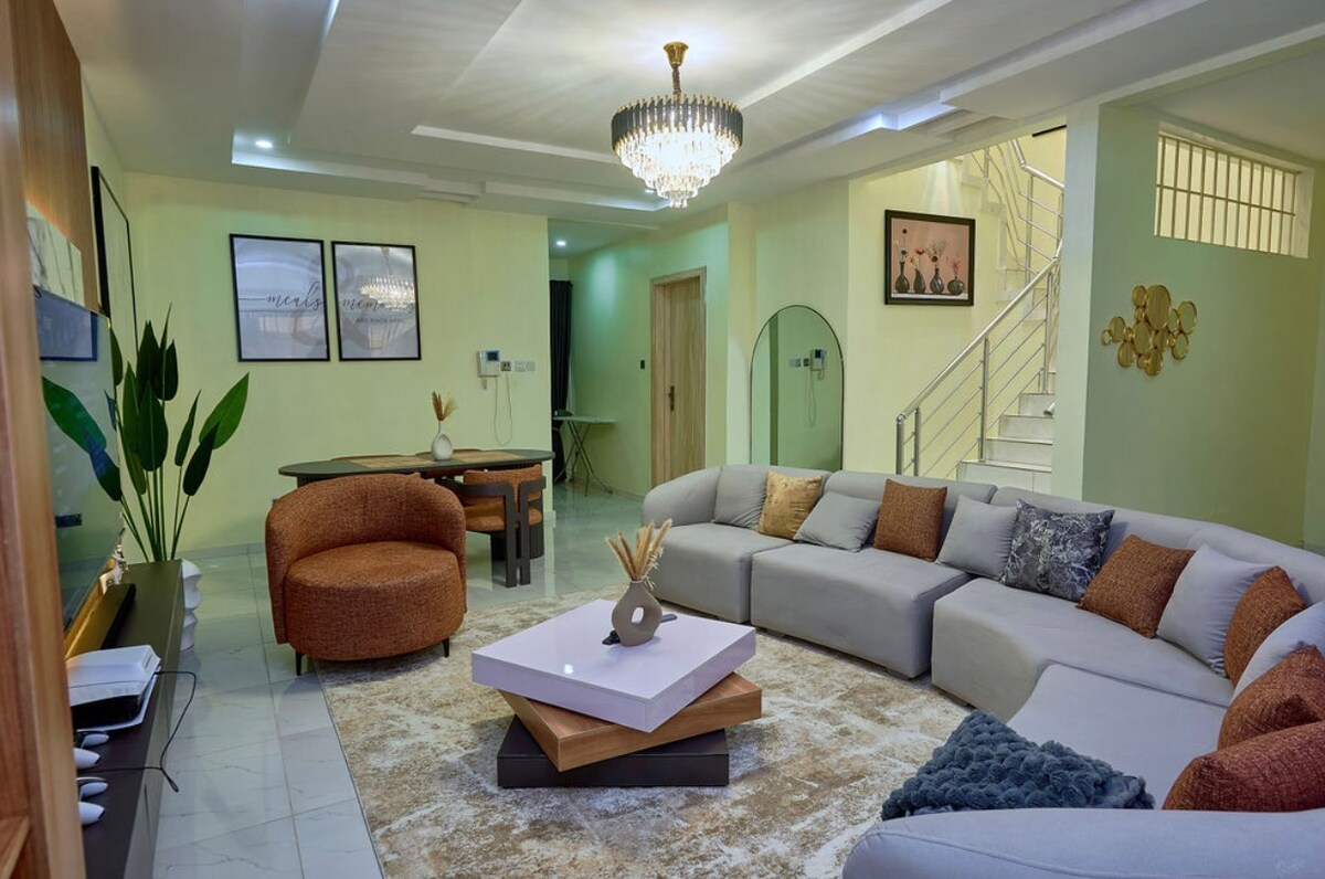 Détendez-vous en famille dans ce logement paisible. La maison est un terrain fermé dans un quartier métropolitain sécurisé. Elle est située dans un domaine habité extérieur pour une sécurité garantie Ce duplex avec terrasse de tourisme se trouve à 3 minutes en voiture de la Lagos Business School, à quelques minutes des cinémas et restaurants Pepperoni et à 15 minutes en voiture des plages de Santa Cruz, Laguna et Atican. Alimentation électrique garantie, pas de bruit du générateur ni de fumées, et quartier serein qui est une maison loin de chez soi.