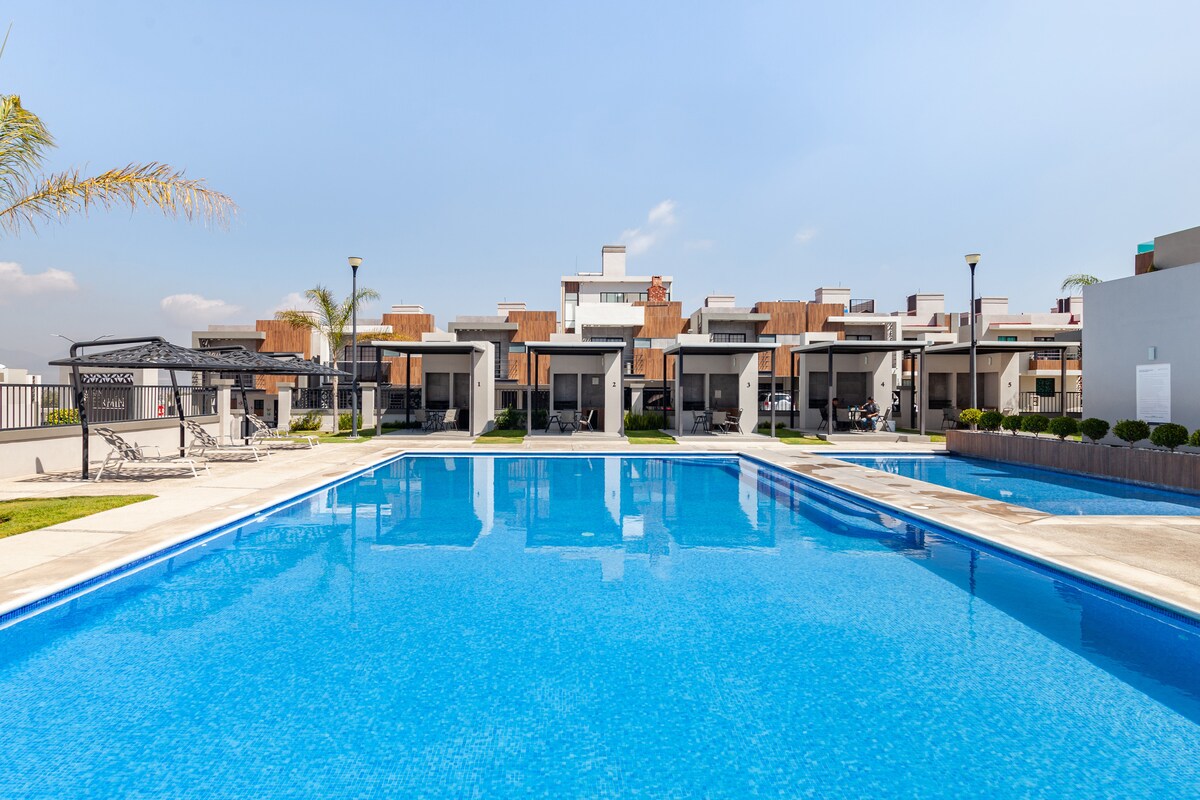 Détendez-vous avec toute la famille à Tizayuca dans le lotissement le plus sûr de la région, avec des piscines pour adultes et enfants, une zone de petgarden fermée, des jeux pour enfants et des terrains de basket-ball et de football. Vous pourrez vous détendre dans la piscine avec palapa et barbecue, à la maison, vous avez tout pour vous reposer et sortir de la routine. Nous nous spécialisons dans les voyages d'affaires où nous offrons des réductions hebdomadaires et mensuelles sans que vous ayez à vous soucier de quoi que ce soit. Nous envoyons du personnel de nettoyage chaque semaine sans frais supplémentaires.