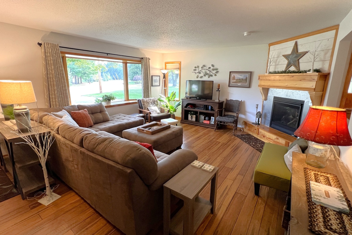 Détendez-vous et amusez-vous dans ce chalet familial. Détendez-vous dans le fauteuil de massage, asseyez-vous autour du foyer ou sur la balançoire de la terrasse, déjeunez à la table de pique-nique, regardez un film sur l'une des quatre téléviseurs intelligents avec Disney+. Cuisine entièrement équipée Situé à côté de Three Bears Lodge et Jellystone Park. Les laissez-passer journaliers et les voiturettes de golf ne sont pas inclus. Location de VTT disponible chez Bear Bogging ATVs. À 25 miles du lac Wazee À 3 miles du McMullen County Park À moins d'une heure de WI Dells À 20 miles de la forêt d'État de Black River