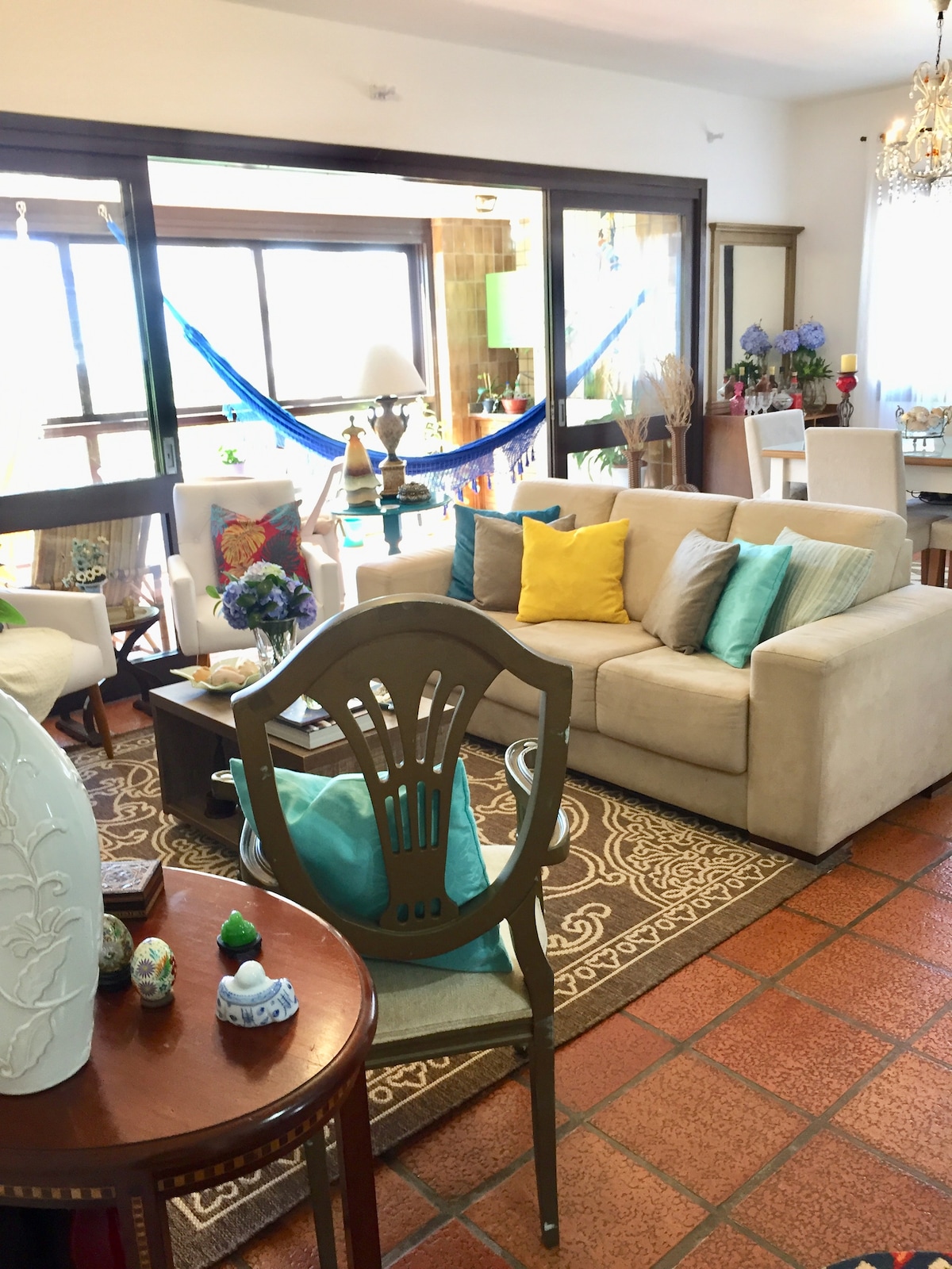 Emmenez toute la famille dans ce super endroit avec beaucoup d'espace pour s'amuser. Nous acceptons les petits animaux, nous fournissons un bac à sable et une mangeoire pour les chats, nous avons un filet de protection sur le balcon et une buanderie. Vue imprenable, accès facile aux supermarchés, pharmacies, magasins… immeuble d'angle avec l'une des principales avenues de la ville et la rue latérale mène à la lagune de violão l'un des plus beaux sites touristiques de la ville. Environ 4 pâtés de maisons de la plage ! ! ! Remarque : nous ne fournissons pas de serviettes.