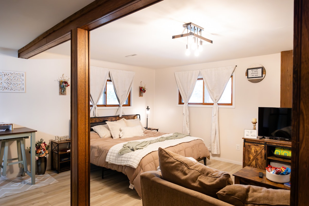 Allez-y doucement lors de cette escapade amusante et relaxante. Profitez de la vie à la campagne et de belles vues dans cette maison d'hôtes/mancave avec une chambre queen size, une kitchenette entièrement équipée, une salle de bain complète, une buanderie, une salle de sport, une aire de jeux et des sièges extérieurs. Cet espace comprend également un lit jumeau pliant et un matelas gonflable queen size si nécessaire. Situé à seulement 10 minutes du lac Milford, le plus grand lac de l'État, à 15 minutes de Fort Riley et à 30 minutes de Manhattan, domicile des K-State Wildcats !
