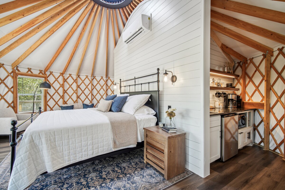 Bienvenue au 969 River Yurts ! Renouez avec la nature en faisant l'expérience du glamping sous son meilleur jour. Cette yourte climatisée se trouve sur une grande terrasse en bois surplombant le fleuve Colorado et partage 13 acres privés avec seulement 1 autre yourte (également disponible à la location). À 30 minutes de l'aéroport et à moins de 10 minutes du centre-ville de Bastrop. Chaque logement dispose d'une salle de bain complète, d'une kitchenette, d'un brasero, d'un barbecue et plus encore ! Profitez d'une escapade romantique dans les arbres avec un coucher de soleil sur la rivière.