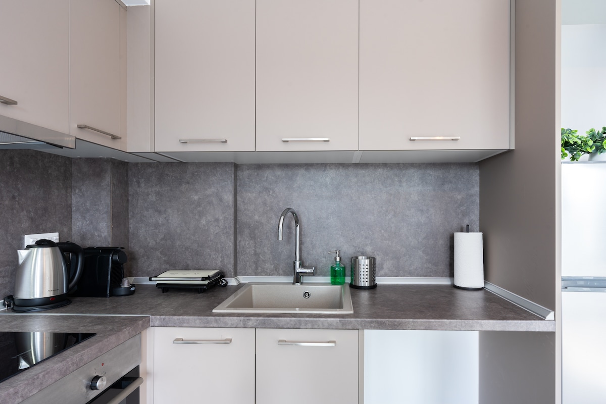 Profitez d'une expérience élégante dans ce logement situé à côté du centre-ville offrant tout le confort ! L'appartement offre suffisamment d'espace pour rendre votre séjour le plus confortable possible. Il est à 10 minutes du centre et à seulement 1 minute de la station de métro. Nos appartements se distinguent par leur propreté. Il y a une petite cuisine ainsi qu'une salle de bains privée. Vous y trouverez un lit double de 1,6*2,0 m. Un canapé convertible de 1,6*2.