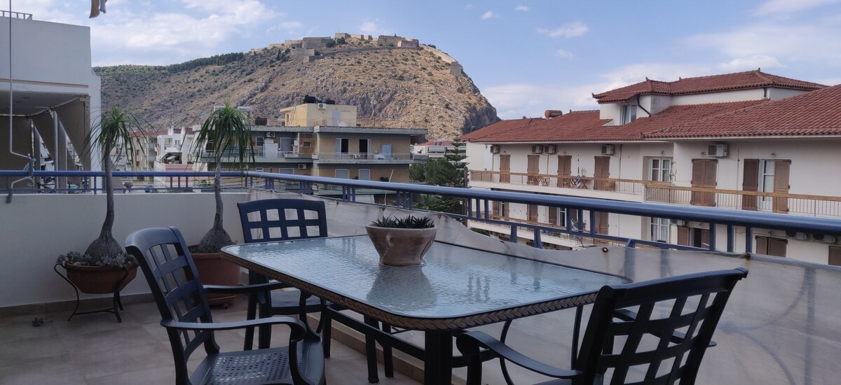 A 50m² penthouse apartment (bedroom, living room, bathroom & kitchenette) roof-garden of 150m²- wonderful view of Palamidi castle & central park. Between new & old part of town. Easy parking. Lift. Sights, shops, bars, restaurants, banks & beach of Arvanitia, within walking distance.