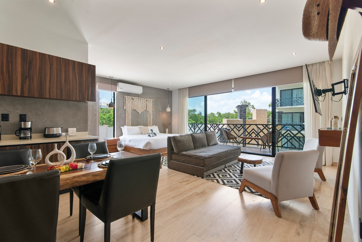 Profitez de cet élégant loft dans la zone hôtelière de Tulum. Vivez dans un complexe résidentiel avec piscines, jacuzzis, rooftop avec piscine à débordement, salle de sport et gastrobar. Transport inclus vers notre club de plage. Entièrement équipé pour un séjour inoubliable. Internet haut débit, idéal pour les nomades numériques ou pour se détendre en regardant sa série préférée. Des espaces confortables pour travailler ou simplement se détendre. Détendez-vous sur votre terrasse privée en admirant le coucher du soleil. Tulum vous attend !