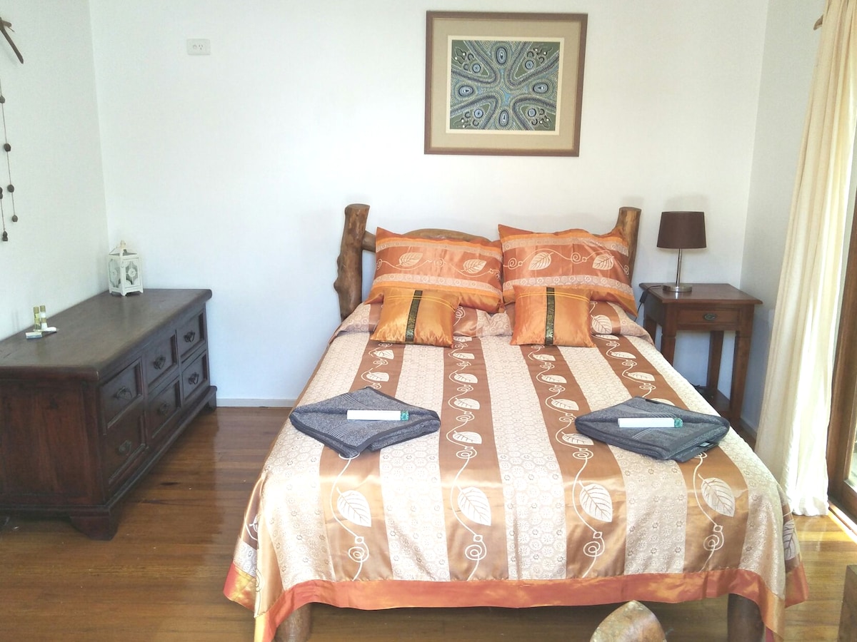 Studio jumelé avec accès privé, salle de bain extérieure rustique et 2 vérandas privées. Situé dans les eaux de Currumbin sur un terrain tranquille et calme de 1 acre. Un emplacement idéal pour accéder aux plages, à la vallée et aux restaurants et cafés locaux. Détendez-vous dans votre bain extérieur donnant sur votre environnement paisible avec un verre de vin ou un café du matin. La chambre se compose d'un lit Queen Size complet avec literie en lin de lin, wi-fi gratuit, réfrigérateur, grille-pain, micro-ondes, muesli gratuit, lait, thé et café.