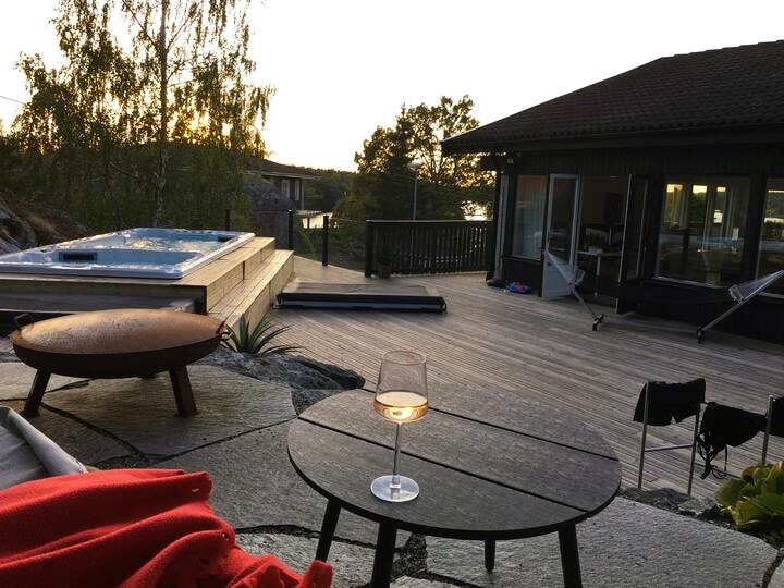Bienvenue dans notre grande maison de 275 m ² avec spa de baignade et vue sur le lac, juste à l'extérieur de Stockholm. Une maison confortable, lumineuse et spacieuse avec 6 chambres, pouvant accueillir 11 personnes, parfaite pour un grand groupe. Situé haut et ensoleillé avec une superbe vue et un jardin privé isolé dans un cadre naturel avec une grande terrasse - à seulement 200 m du lac. La maison offre tout pour un séjour agréable – le mélange parfait étant proche de la belle nature et entrant dans la ville en moins de 35 minutes en bus,ou à 20 minutes en voiture !