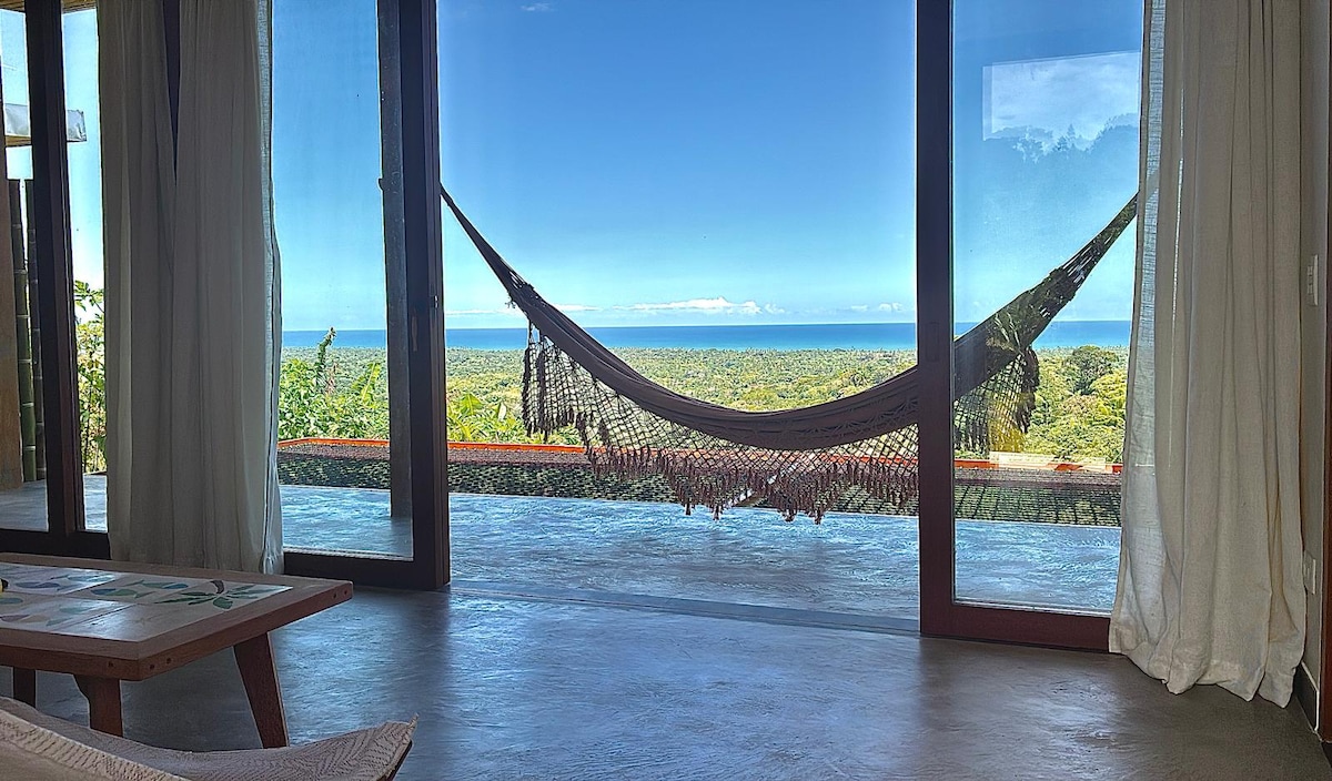 cabane en bois de charme avec balcons et petite bibliothèque avec des livres sur la nature et la vie. Grand paysage au bord de la mer depuis le sommet d'une montagne à 100 mètres au niveau de la mer. Paix et sécurité, à 2 km du sympathique village de Serra Grande. Refuge de la faune : petits primates, sloths, peccaries et fourmiliers. Région des agriculteurs traditionnels de cacao, de manioc, de noix de coco et de volaille. Équipement de surf, canoë-kayak, vélo.