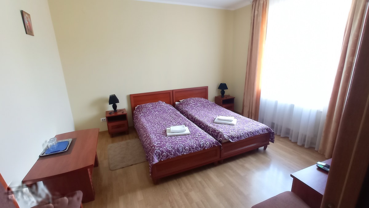 Гостинне, домашня атмосфера підкреслюється затишком та комфортом номерів. Наші номери пристосовані як для відпочинку гостей, так і для ефективної роботи: зручні меблі, система кондиціювання та отеплення, супутникове телебачення, Wi-Fi, міні-бар. Для вашої зручності є ліфт, автостоянка, ресторан, цілодобова стійка реєстрації гостей, цілодобова служба охорони, консьєрж-сервіс, безкоштовний Wi-Fi на всій території готелю, термінал для оплати карткою.