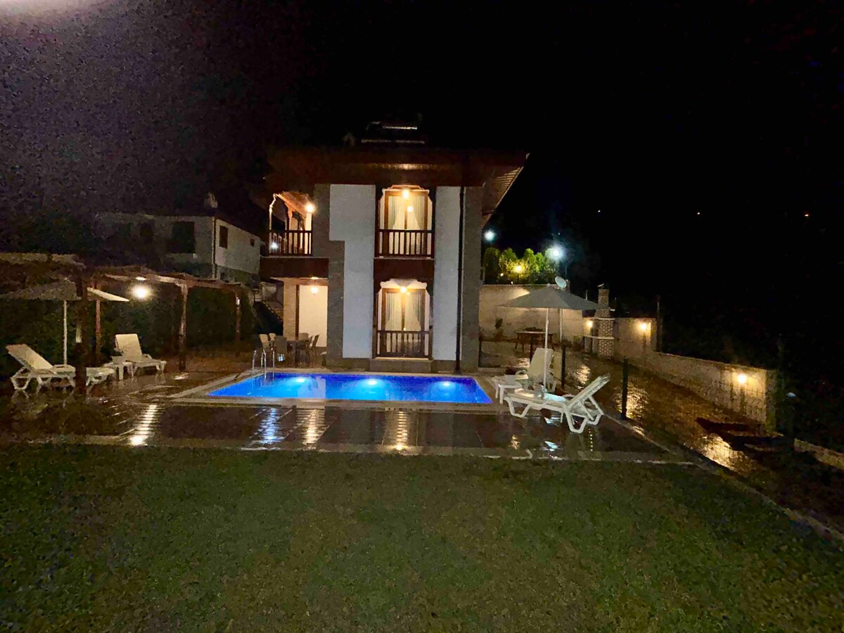Située à 7 km d'Akyaka, notre villa est située dans un quartier calme , entouré de forêts dans la nature ; c'est un lieu de paix complètement détaché en pierre avec une piscine et des détails en bois. Le jardin de notre villa est meublé avec de l'herbe et diverses plantes et a une superficie de mille mètres carrés. À 4 km de la plage de surf Kite, à 30 km du centre de Muğla, à 60 km de l'aéroport de Dalaman, à 30 km de Marmaris.