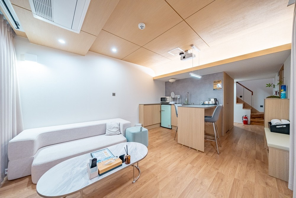 La chambre et le salon sont séparés et équipés d'équipements tels que induction, micro-ondes, lave-linge, lave-linge et réfrigérateur pour cuisiner. De plus la salle de sport gratuite est disponible, et vous pourrez profiter de la merveilleuse vue sur la rivière Taehwa dans la chambre.