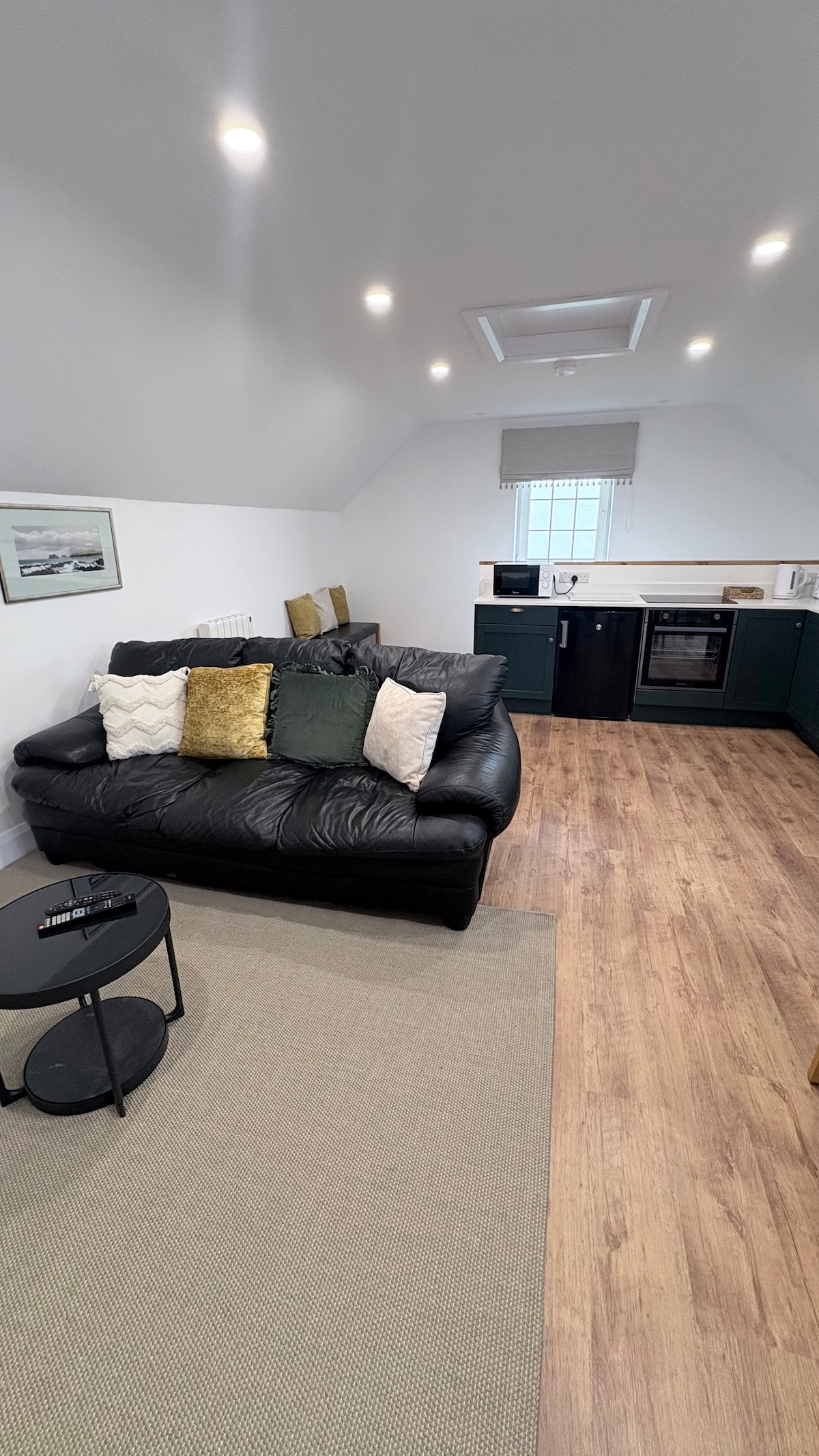 Appartement loft lumineux, aéré, gai et bien décoré, une chambre avec lit King Size et canapé convertible en lit simple (3' 6" de large) ou double (4'8") dans le salon. Il y a une douche attenante avec chauffe-eau et WC. Une cuisine moderne entièrement équipée avec réfrigérateur, lave-linge, plaque de cuisson électrique, four micro-ondes, bouilloire et grille-pain. Télévision Sky Q 46" à écran plat (toutes les chaînes) avec connexion Wi-Fi gratuite. Nous avons 3 hébergements séparés (pouvant accueillir 9 à 10 personnes, pas de groupes de filles ou de gars).