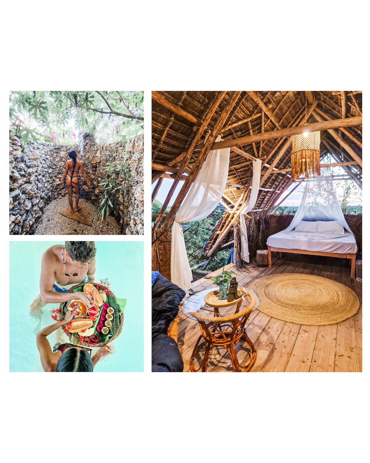 Nid de jungle éco-luxe pour les âmes sœurs et les chercheurs. Survolez la forêt dans cette cabane dans les arbres artisanale avec salle de bain en plein air en pierre de corail, filet pour observer les étoiles et douche cascade. Profitez d'un petit-déjeuner végétarien, d'une piscine sous une tente fleurie, de suppléments spirituels et de la paix de la jungle, à quelques minutes des plages de Jambiani. Un refuge sacré pour les jeunes mariés, les amoureux et les âmes sauvages prêts à renouer avec la nature et avec eux-mêmes.
