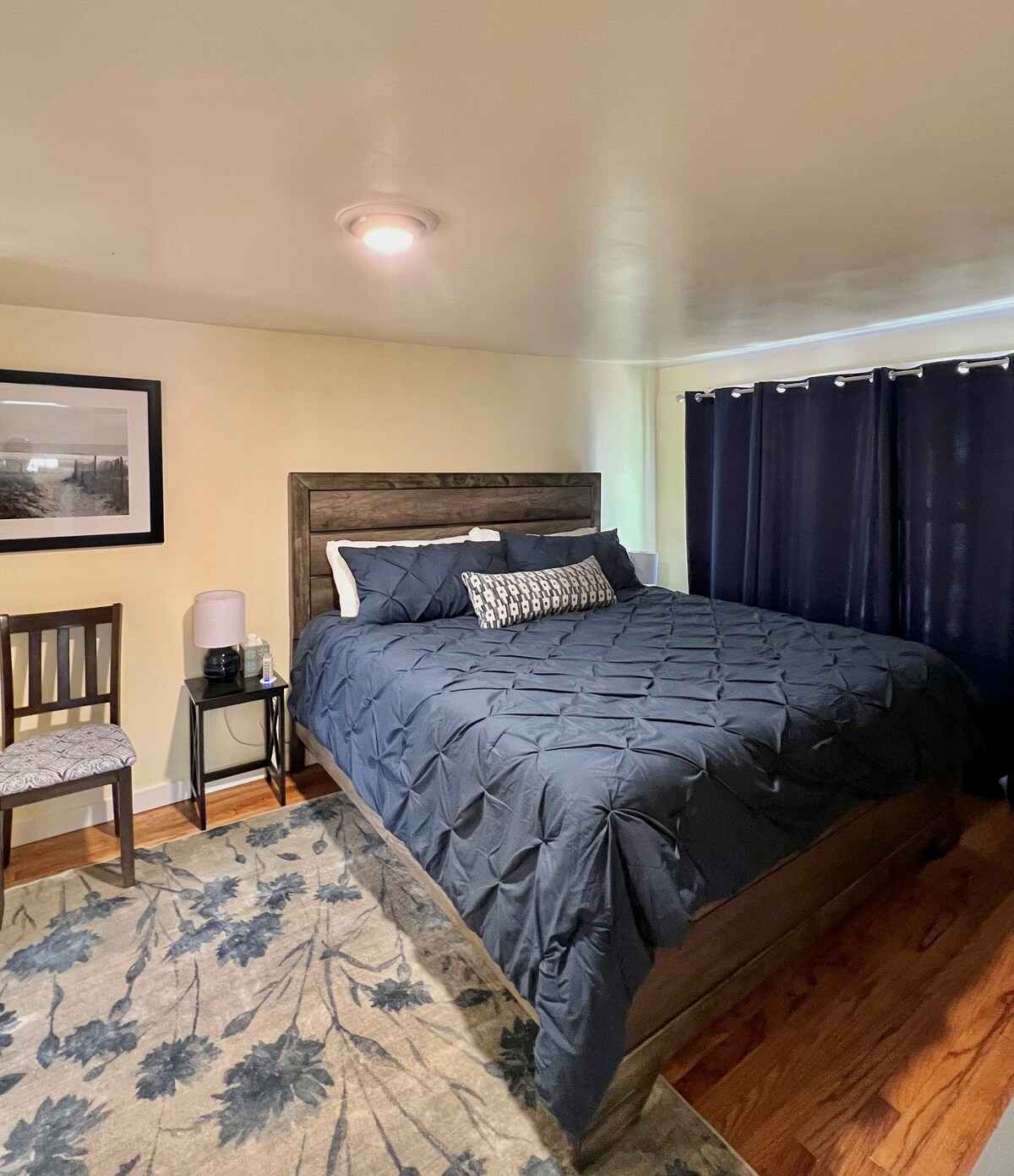 1 lit king size avec grande cour arrière clôturée. Animaux acceptés.