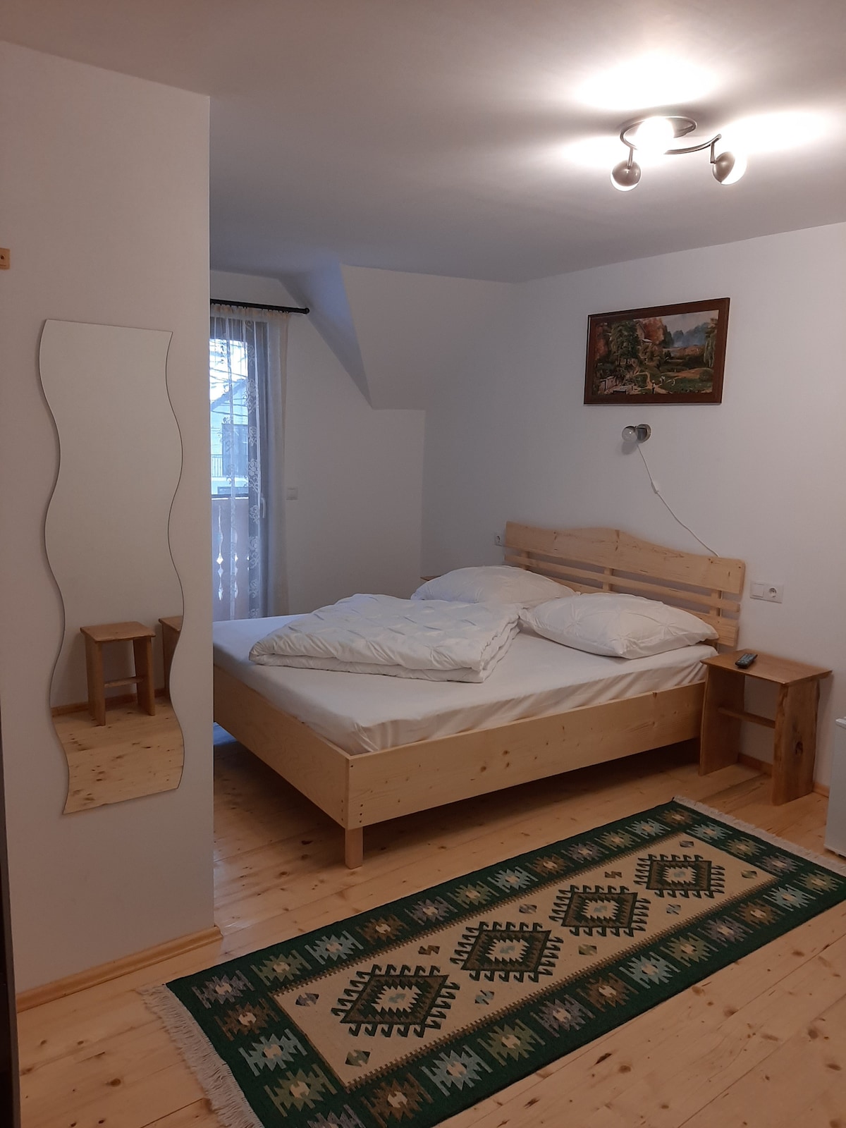 Une maison en bois dont l'architecture est particulière, avec un sol en bois et une terrasse avec une vue magnifique sur le village et les collines couvertes de vergers, située à 6 km de Sighet, Maramures. Les chambres sont lumineuses et les plafonds sont en bois. Chacun d'entre eux est peint et décoré dans une certaine couleur, offrant une chaleur particulière. L'impression générale fait partie des plus agréables. Le mobilier est fait de bois naturel, de style rustique.