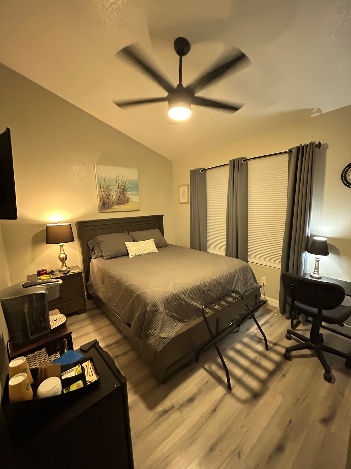 Une chambre privée confortable avec une entrée extérieure privée codée et sa propre salle de bain. Un espace petit et simple pour le voyageur minimaliste. Un lit double avec un lit double gigogne pour un maximum de 2 personnes. Il n'y a pas de télévision, mais nous avons une excellente connexion Wi-Fi si vous souhaitez regarder des émissions depuis votre ordinateur portable/appareil. Il y a un bureau, une commode et un placard pour vos affaires. La salle de bain dispose d'une douche, d'une armoire à pharmacie et d'étagères. Il y a un mini-réfrigérateur et un micro-ondes pour que vous puissiez stocker et réchauffer vos denrées périssables. Les ustensiles et les assiettes ne sont pas toujours inclus.