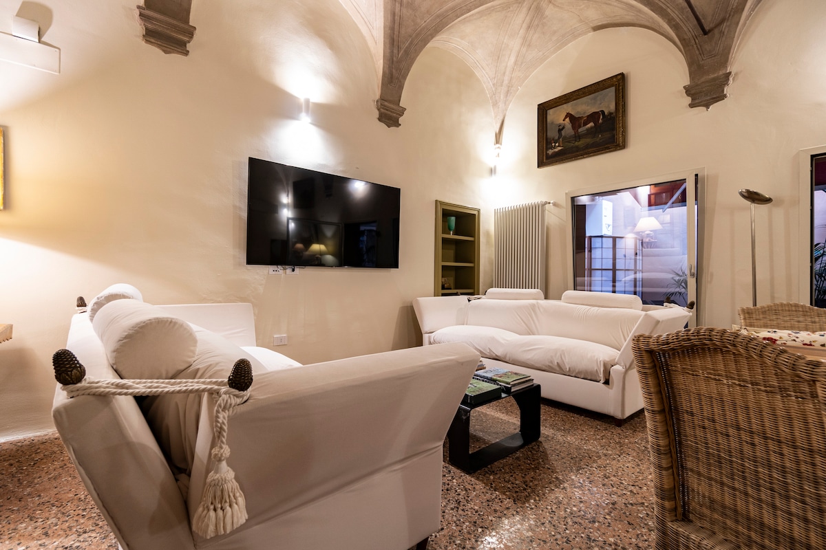 Le Loft est situé en plein cœur de Ferrare, dans l'une des rues les plus charmantes du centre historique. Un environnement chaleureux, accueillant et soigné. La maison bénéficie d'une entrée indépendante et se développe entièrement sur un étage. Il se compose d'une cuisine, d'une salle de bain, d'un grand salon et d'une chambre. Il dispose d'une cour intérieure privée à disposition. Un studio artistique transformé en un espace unique où artStoria se fondent en harmonie avec le présent. Idéal pour vivre l'atmosphère romantique de Ferrare.