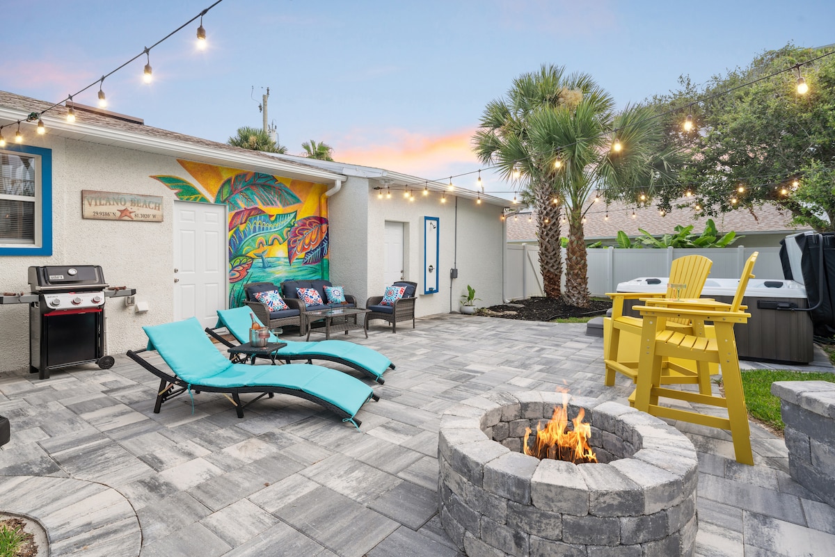 Étendez-vous sur 1750 pieds carrés dans cette RETRAITE SUR LA PLAGE DE STYLE FLORIDIEN qui appelle à la DÉTENTE. Accueillez 6 personnes dans notre maison 3 CH/2 SALLES DE BAINS spacieuse nichée entre la plage calme de Vilano et la voie navigable Intracoastal parfaite au coucher du soleil. Profitez pleinement de la commodité d'une promenade de 5 minutes jusqu'à la plage, de 2 minutes jusqu'à l'Intracoastal pour les couchers de soleil tous les soirs, et profitez de cocktails, de bains de soleil et de la brise de Floride sur la terrasse du 2e étage ou divertissez-vous en bas dans la cour spacieuse avec jacuzzi, tous deux protégés par un grand lanai.