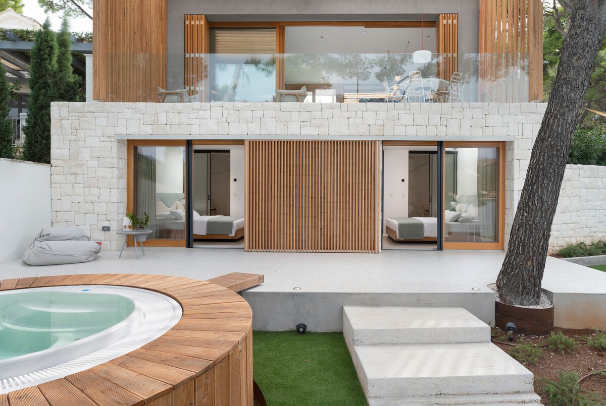 La potion magique pour votre âme, votre esprit et votre corps. L'élixir de la vie. C'est comme ça que vous vous sentirez dans notre logement. L'ensemble du logement est réservé à un seul couple. On a l'impression d'être complètement loin de tout, des problèmes, du stress et des gens. Piscine extérieure à débordement et vue panoramique sur la mer à la baie de Marina et les îles dont vous pouvez profiter en toute intimité vous donnera un plaisir inoubliable. Notre petite maison a tout ce dont vous avez besoin pour vos vacances, et elle ravira votre âme et votre cœur.