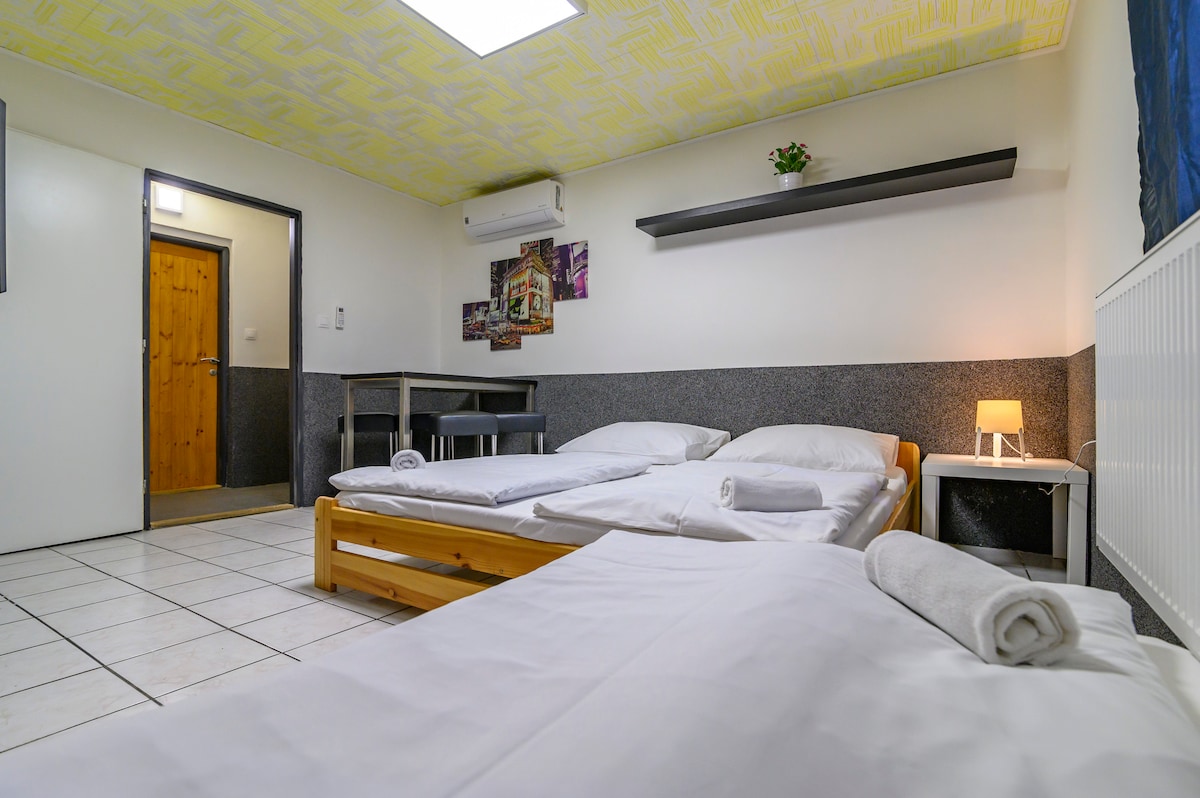 Détendez-vous dans notre chambre spacieuse avec salle de bain attenante, dotée d’un lit double et d’un lit simple, idéale pour un couple ou un petit groupe d’amis. Profitez d'une kitchenette commune, d'une terrasse ensoleillée, d'un jardin paisible (si le temps le permet) et de notre bar sur place. Situé dans un bâtiment d'auberge avec réception en bas, vous aurez le choix entre une intimité totale ou une connexion avec d'autres voyageurs. Passez nous voir pour des cartes, des conseils, un café ou une bière tchèque fraîche à tout moment !