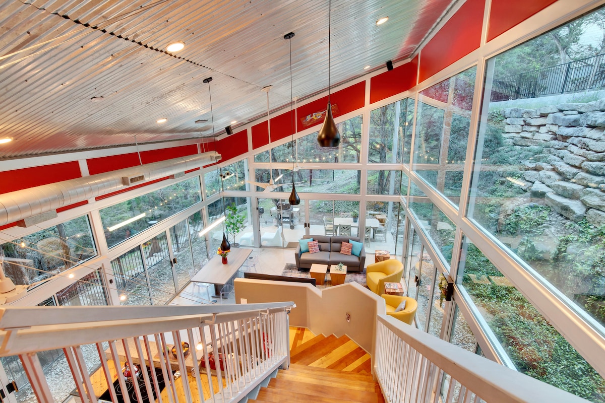 Plongez dans la nature à la Austin Glass House. Cette maison spéciale loin de chez vous, proche de tout ce qu'Austin a à offrir, est néanmoins un refuge privé. La propriété verdoyante est nichée le long d'un ruisseau saisonnier alimenté par une source et d'une ceinture verte bordée d'arbres qui offre un accès à la beauté de la Hill Country. Vue dans le film Abilene and Bay. Également sur HGTV, la maison de verre d'Austin, unique en son genre, est une retraite parfaite pour les couples à la recherche d'une escapade romantique ou pour ceux qui recherchent une escapade relaxante.
