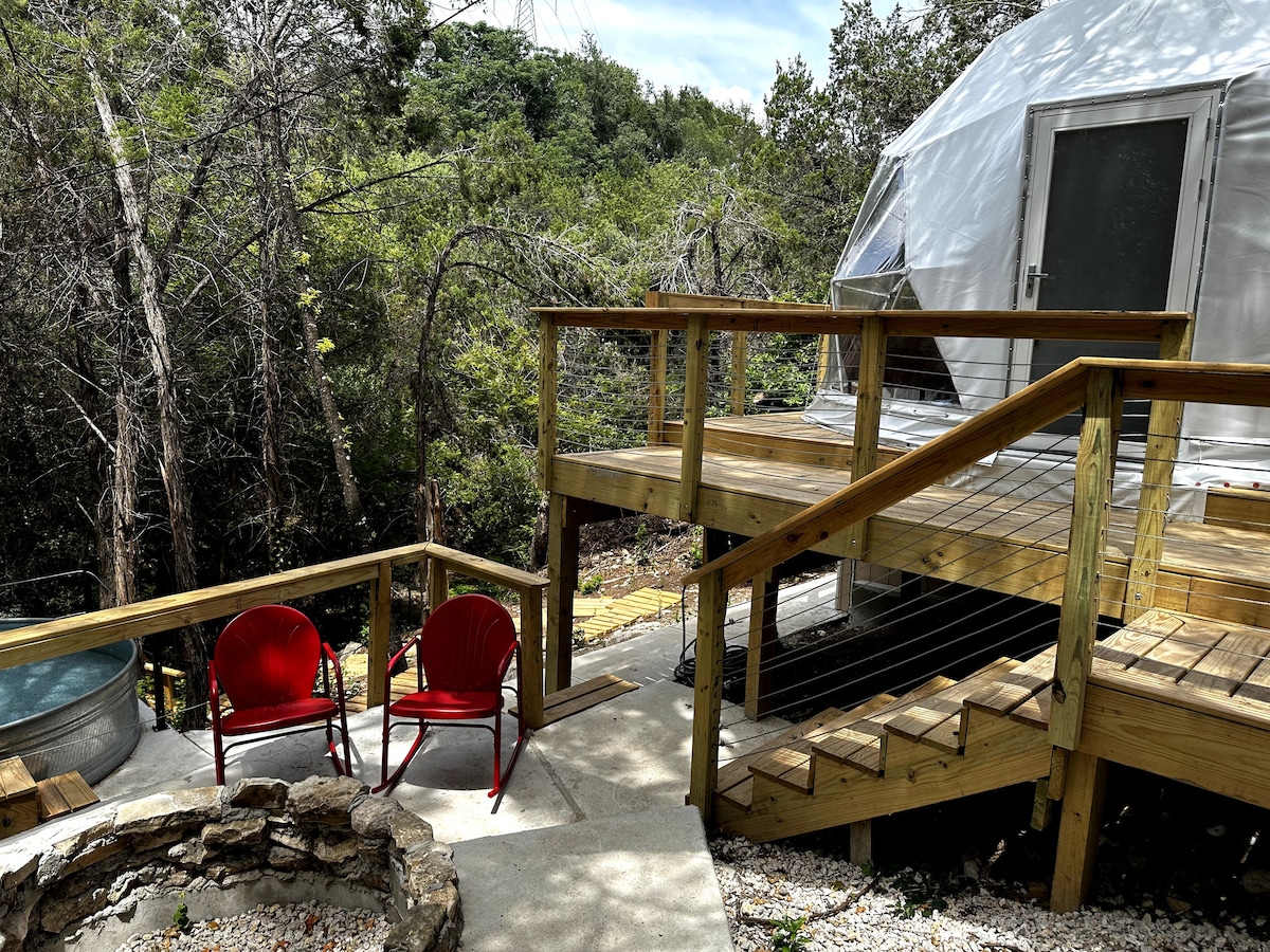 Évadez-vous dans notre dôme loin de chez vous ! Un havre de paix unique sur le lac Travis. Niché dans un canyon serein sur 2 acres, vous profiterez de l'intimité, d'un ruisseau alimenté par une source et de la proximité d'Austin (25 min). Détendez-vous dans une piscine de cow-boy chauffée de style texan, profitez de feux étoilés, d'une salle de bain luxueuse et d'un ruisseau dans un oasis de calme mais proche des commodités (épiceries et restaurants à 3 minutes). L'emplacement est très privé.