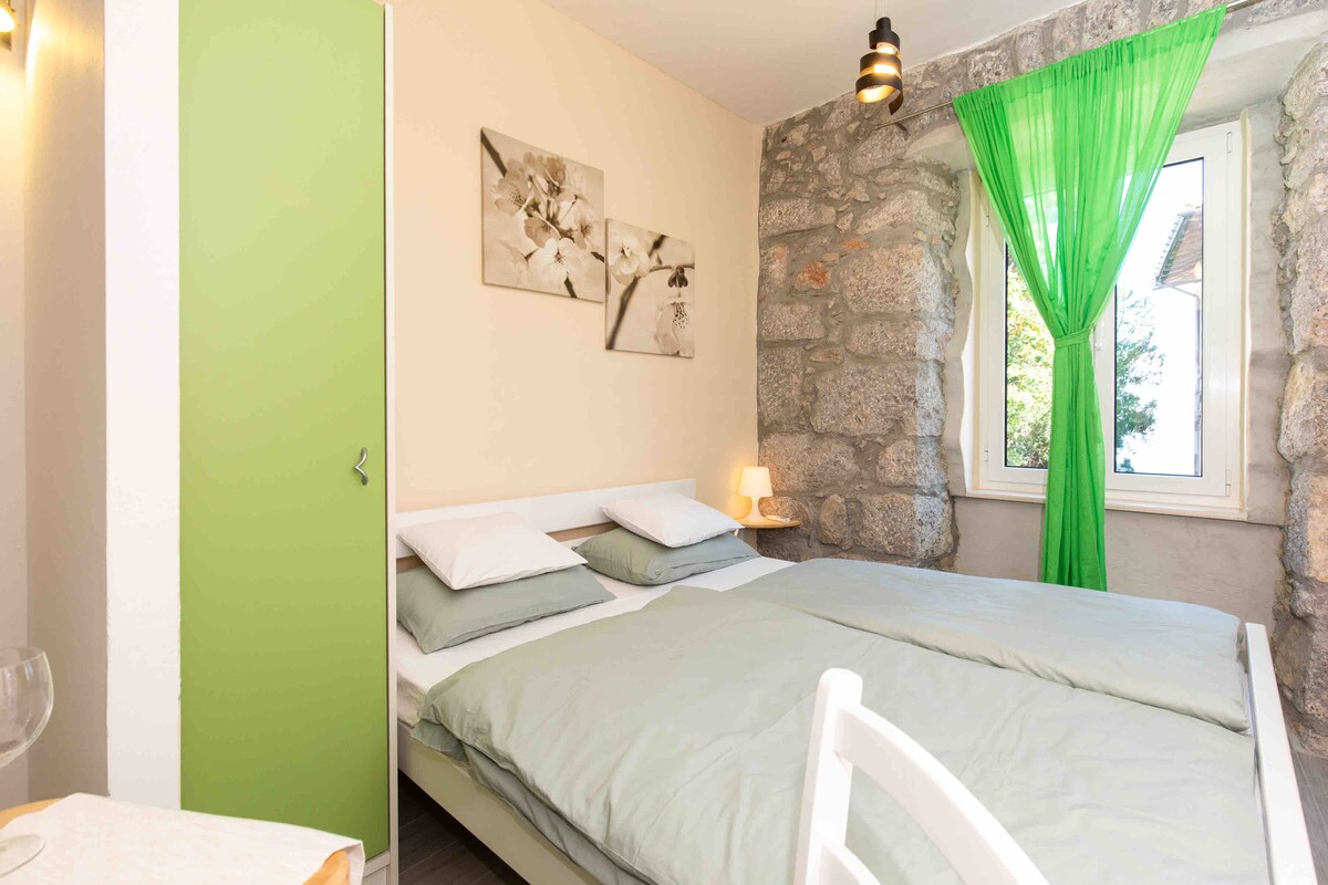 Notre studio est au rez-de-chaussée d'un bâtiment vieux de plus de 100 ans. Grandes fenêtres donnant sur la terrasse avec une vue charmante sur la mer. À 5 min des plages rocheuses et de galets, de Lungomare, de restaurants de poissons et de pizzerias. À 15 min du centre-ville d'Opatija (théâtre en plein air, plus de restaurants, plage de sable), à 15 min en voiture de Kastav, à 30 min en voiture de Moscenice et de Rijeka. À 45 min en voiture d'Učka. À 3 min de l'arrêt de bus (ligne 32 de Rijeka).