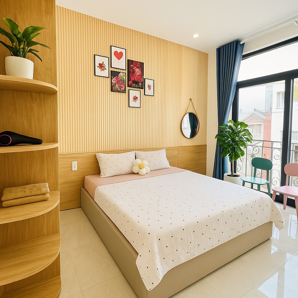 ✔️ Phòng Apartment(40m2) - 1 Giường 1.6m x 2m - Cửa Sổ Kính Cong cực rộng - Ban Công + Bàn ghế cafe - View Nội Khu Yên Tĩnh Thoáng Mát - Lưới chống muỗi, côn trùng - Thiết kế CNC sang trọng ấm áp - Ghế Sofa êm ái + Bàn trà - Bếp Điện & Full Dụng Cụ Bếp Nấu - Bồn Rửa Chén Bát - Lò Vi Sóng + Máy Giặt Gia Đình - Máy sấy, Ấm siêu tốc + Tủ Lạnh Mini - 2 Ly Thuỷ Tinh , Muỗng - 1 Bình Trà Thuỷ Tinh + 2 Gói Trà + 1 Gói Coffee Hoà Tan - Wifi, Smart TV 43 Inch Youtube - Vòi Sen Tắm Đứng Nóng / Lạnh
